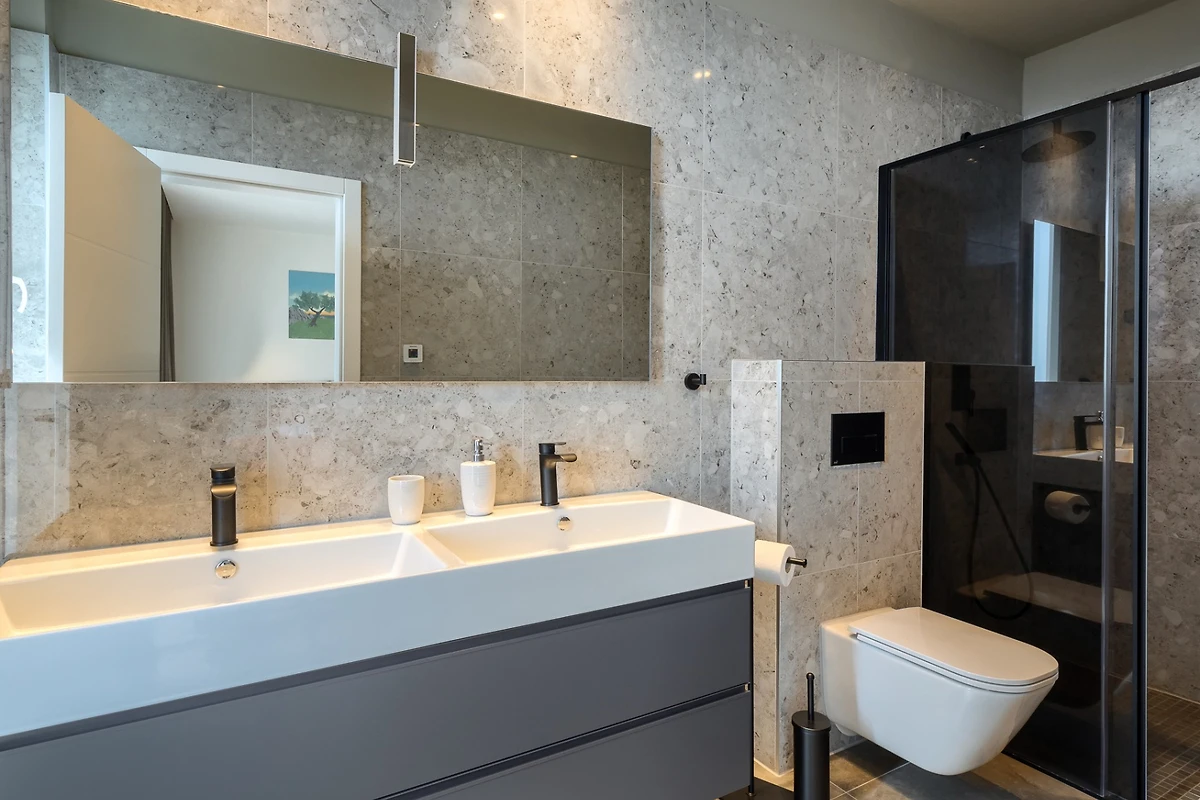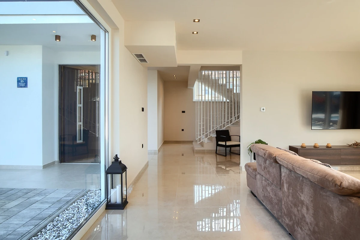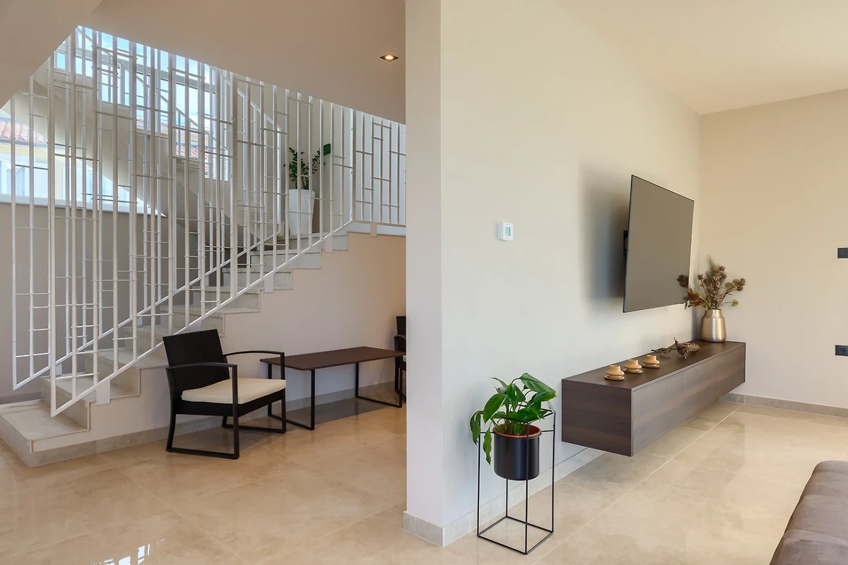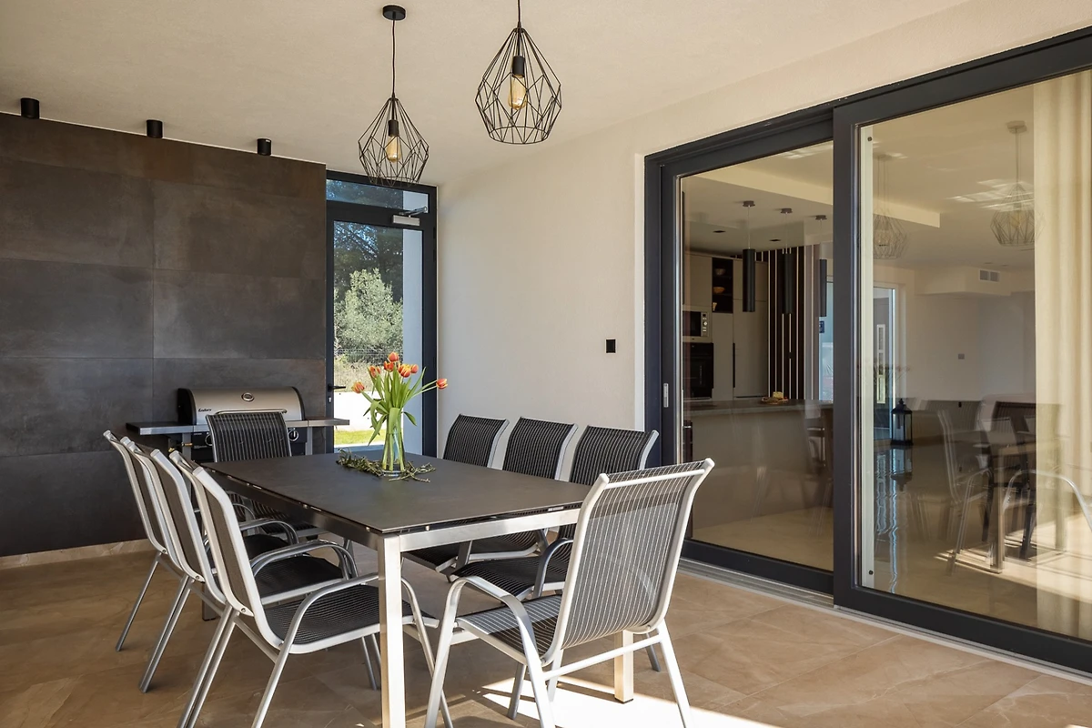 Die Villa umfasst eine Fläche von 270 m² und besteht aus einem Erdgeschoss und einem Obergeschoss. Das Erdgeschoss zeichnet sich durch einen offenen Grundriss aus, in dem Sie ein Wohnzimmer und eine voll ausgestattete Küche mit einem Esszimmer finden. Das Wohnzimmer ist mit einem grossen Sofa und einem Fernseher ausgestattet, und der Esstisch mit 8 Stühlen ist ideal zum Entspannen und Unterhalten. Die Küche ist mit allen notwendigen Geräten ausgestattet, um köstliche Mahlzeiten zuzubereiten, die sowohl am Esstisch im Haus als auch am Esstisch im Freien genossen werden können. Neutrale Farben in Erdtönen, kombiniert mit dunklen Metallelementen, dominieren den Raum. Alle Räume sind klimatisiert und für die kälteren Tage gibt es Fussboden- und Zentralheizung.
