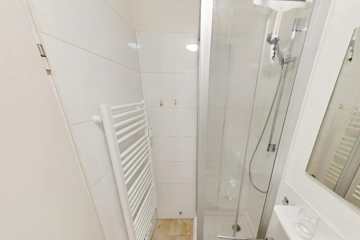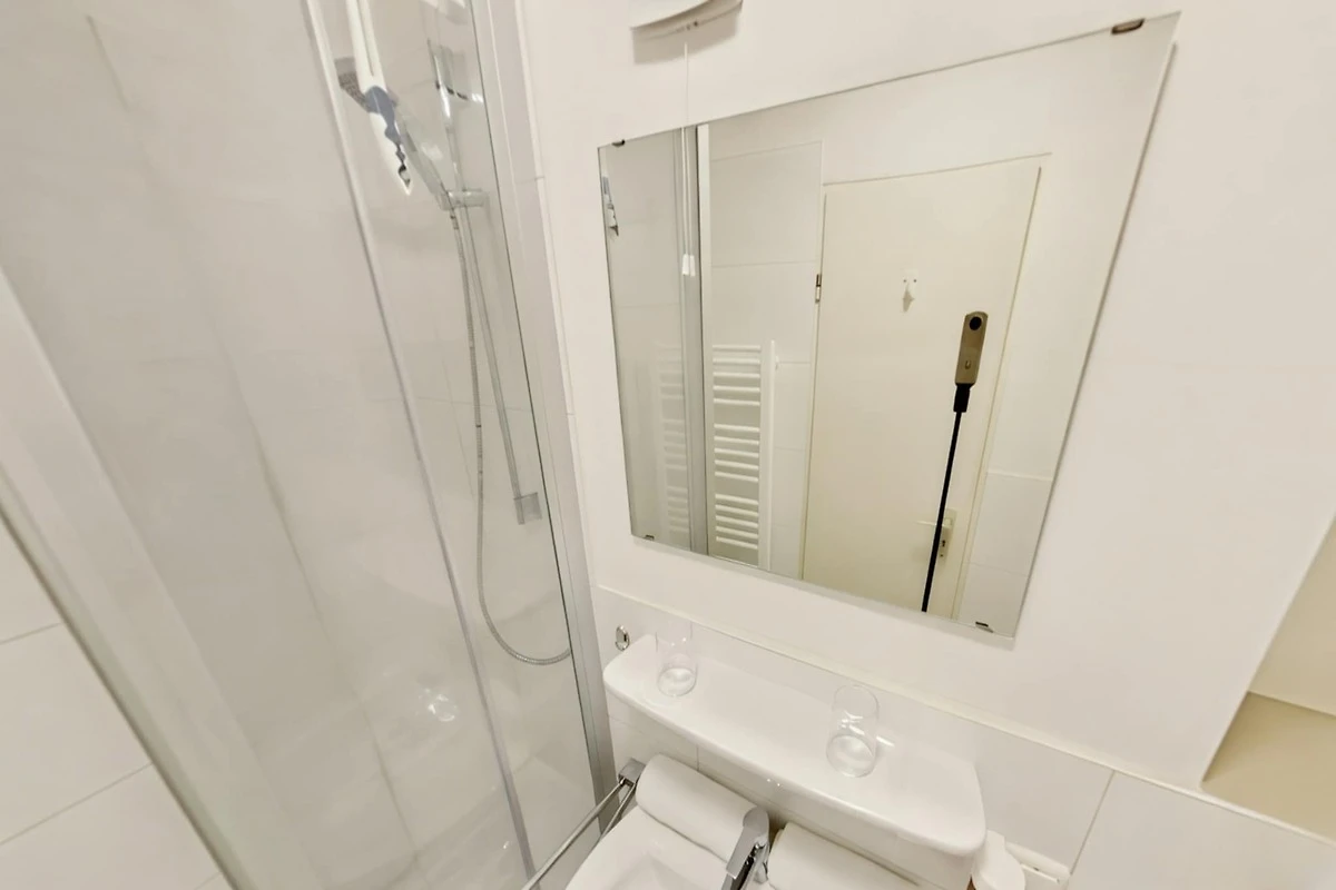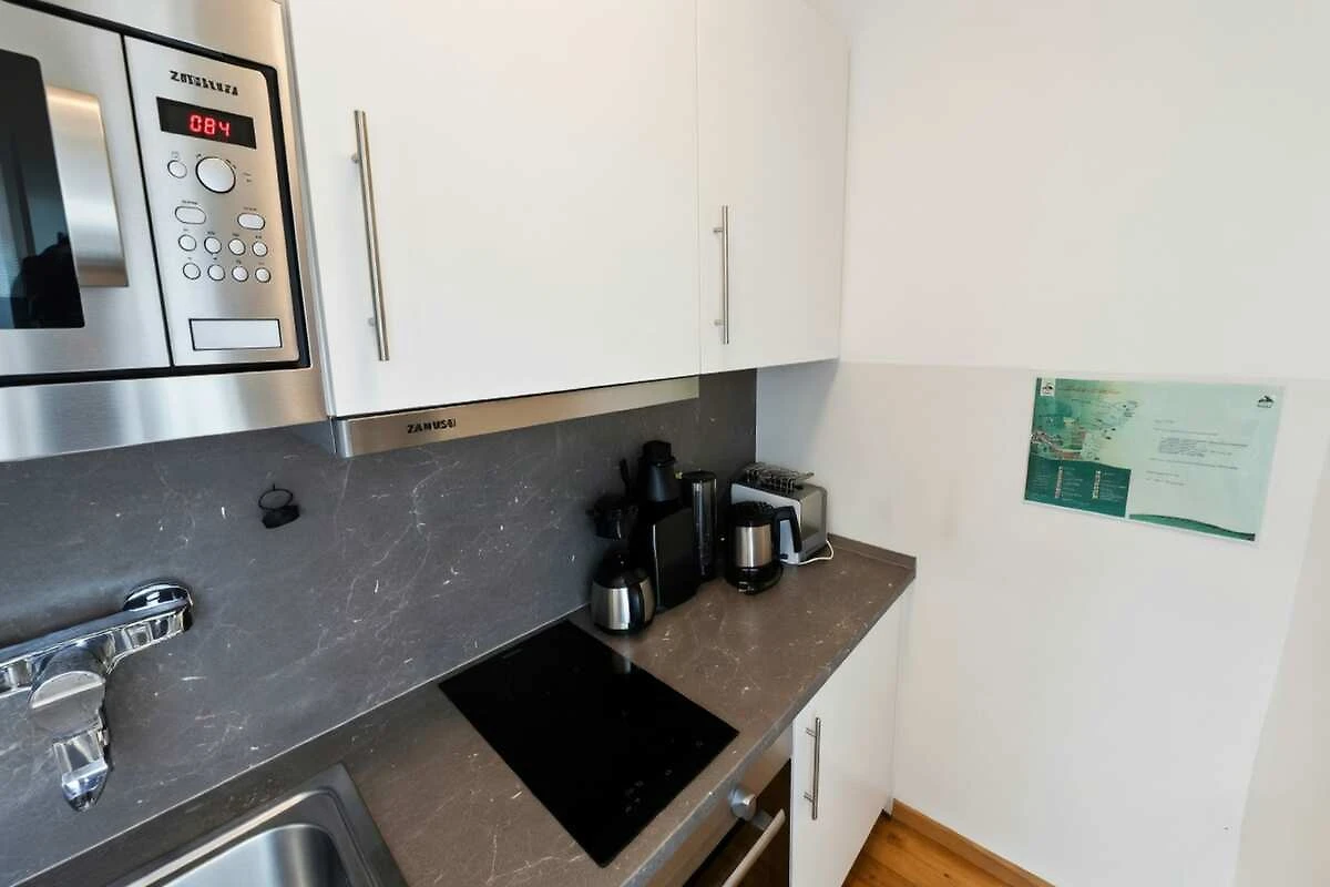 In der 6. Etage: (Küche(Esstisch, Kochplatte(4 Kochplatten, Ceranfeld), Wasserkocher, Toaster, Kaffeemaschine, Backofen, Mikrowelle, Kühlschrank), Wohn-/Schlafzimmer(Schrankbett für 2 Personen, TV(Kabel, Flatscreen)), Badezimmer(Dusche, Waschbecken, Toilette, Föhn), Balkon)