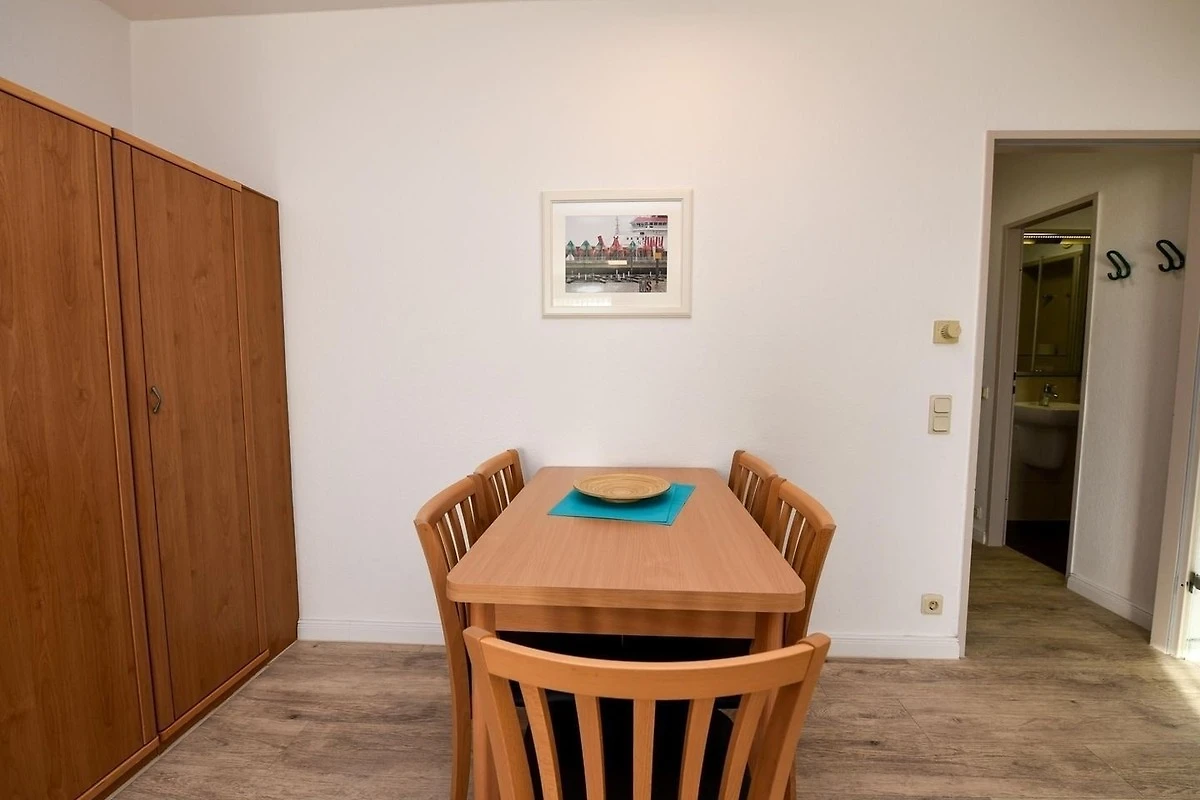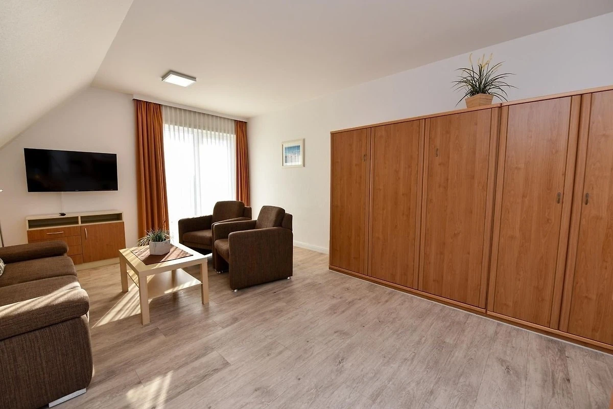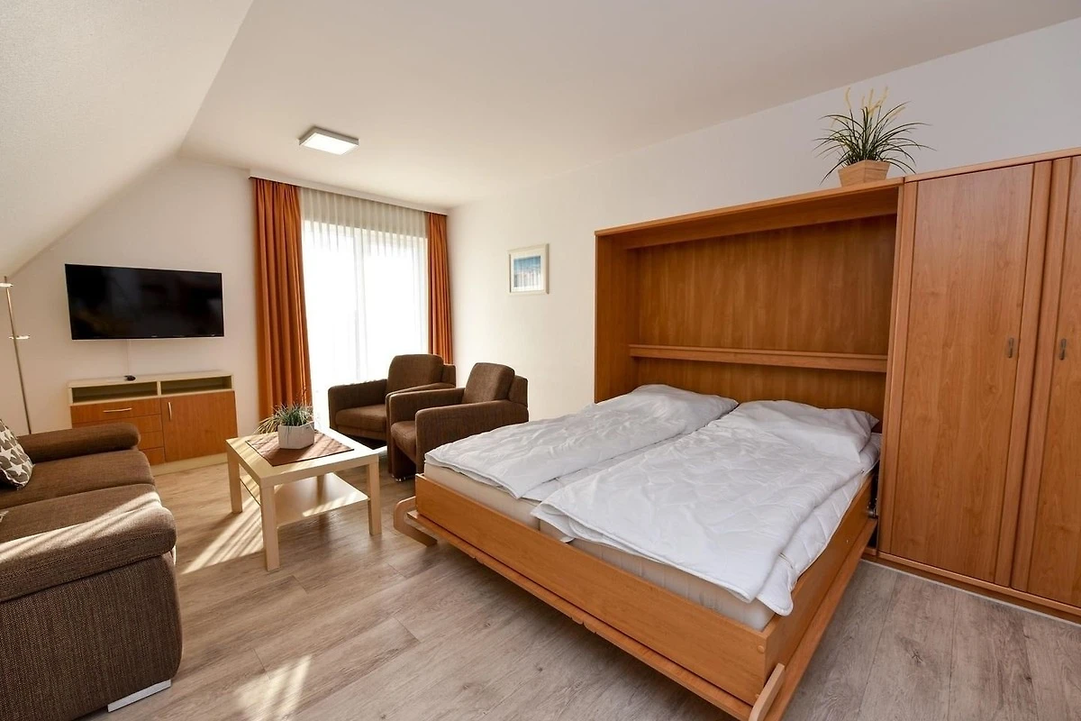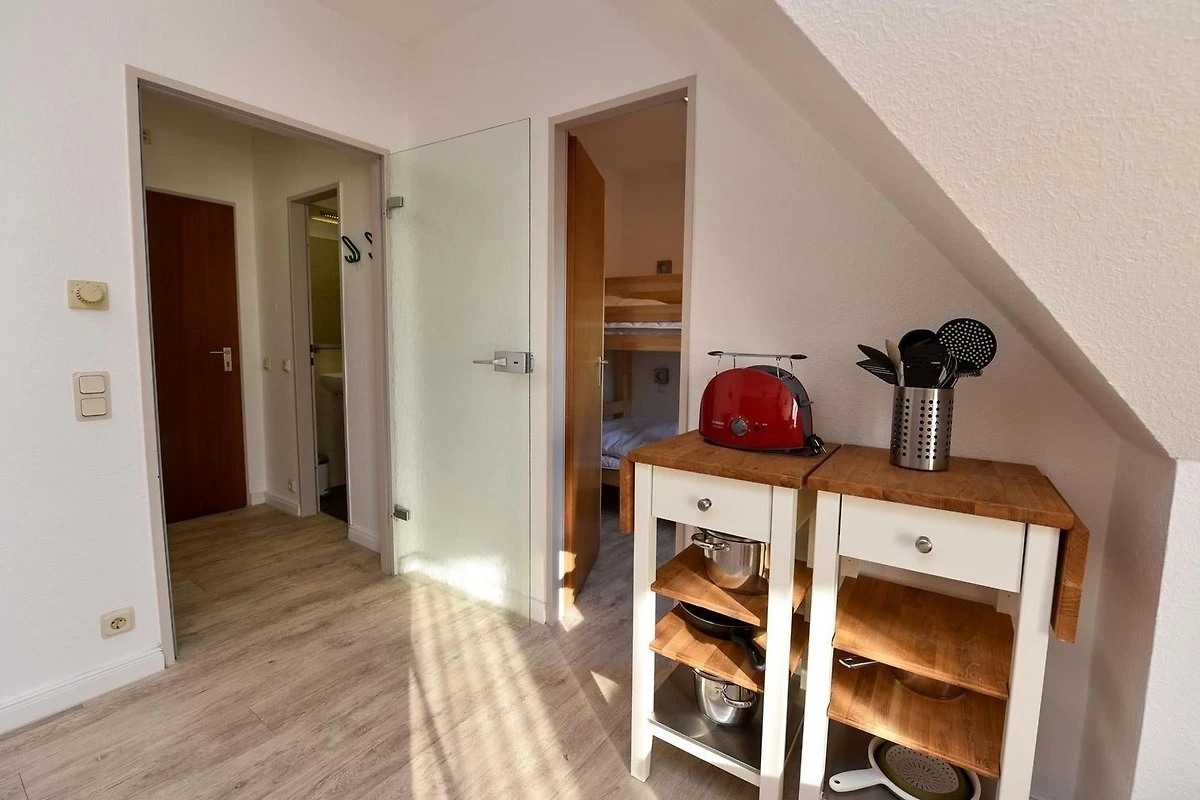 2-Zimmer Appartement im Haus "Nige Wark". In der TV-/Leseecke im Wohnzimmer befindet sich ein gemütliches Zweisitzer-Sofa, zwei Sessel und ein Flat- TV. Die integrierte Küchenzeile mit Spülmaschine, Mikrowelle und Kühlschrank mit Gefrierfach ist komplett ausgestattet und der ausziehbare Esstisch bietet genügend Platz für alle. Im Wohn-/Schlafraum befindet sich zusätzlich noch ein ein Schrankbett (2x90x200). Im Schlaf-/Kinderzimmer steht ein Etagenbett. Das Badezimmer ist mit einer Dusche und WC ausgestattet. Die ca. 40 qm grosse Wohnung liegt im 2. OG und verfügt zudem auch über einen Balkon zum Garten