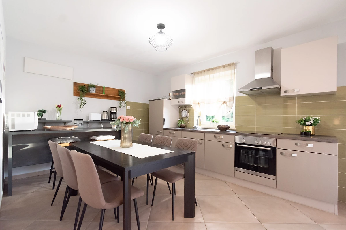 ✔️ Eine voll ausgestattete Küche mit direktem Zugang zur Terrasse