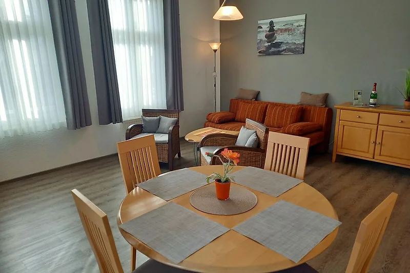 Wohnraum: grosse gemütliche Schlafcouch, Couchtisch, zwei Sessel, grosser runder Esstisch mit Sitzmöglichkeit für 4 Personen, Mini CD Stereoanlage, Flachbildfernseher mit DVD - Funktion und Kabelempfang, kleine DVD - Sammlung, eine gut sortierte kleine Familienbücherei, Spielesammlung, grosser Kleiderschrank, 2 Anrichten / Kommoden