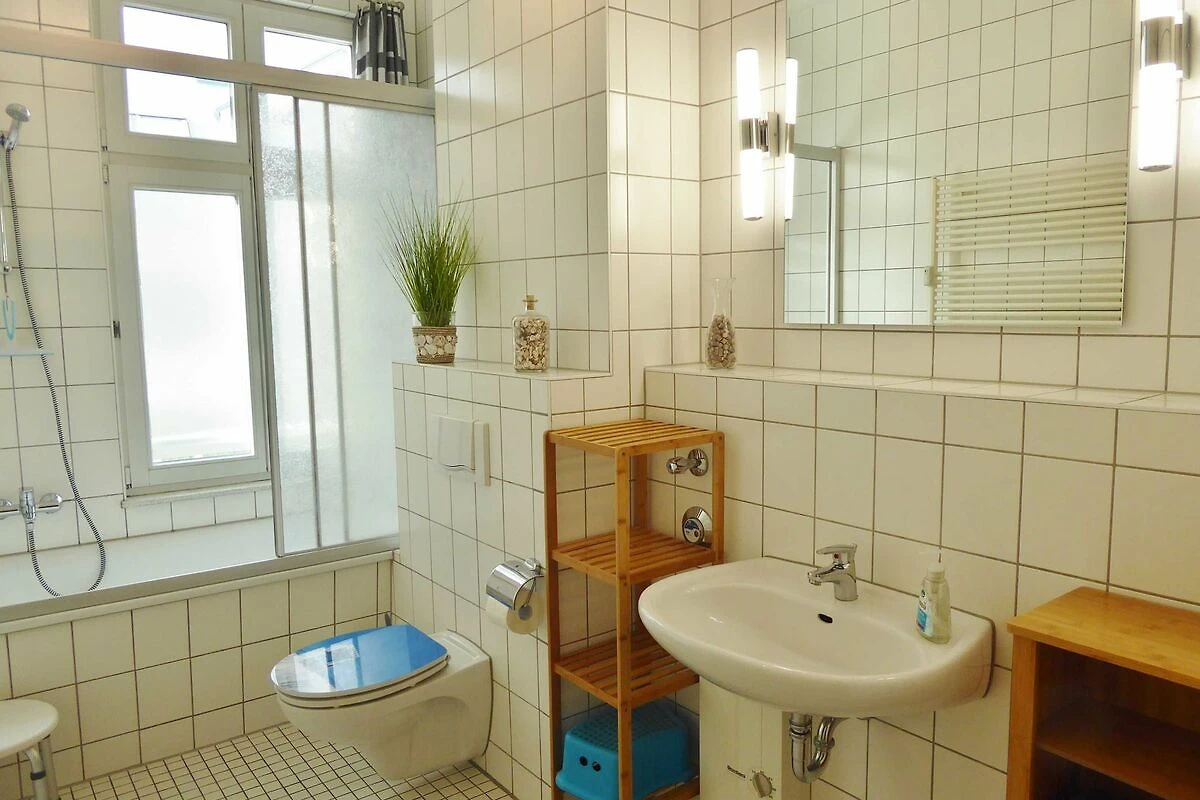 Badezimmer Badewanne / Dusche, grosser beleuchteter Spiegel, Waschbecken, WC, Handtuchheizkörper