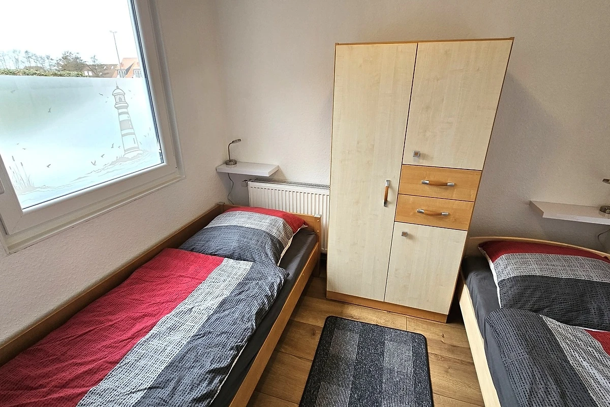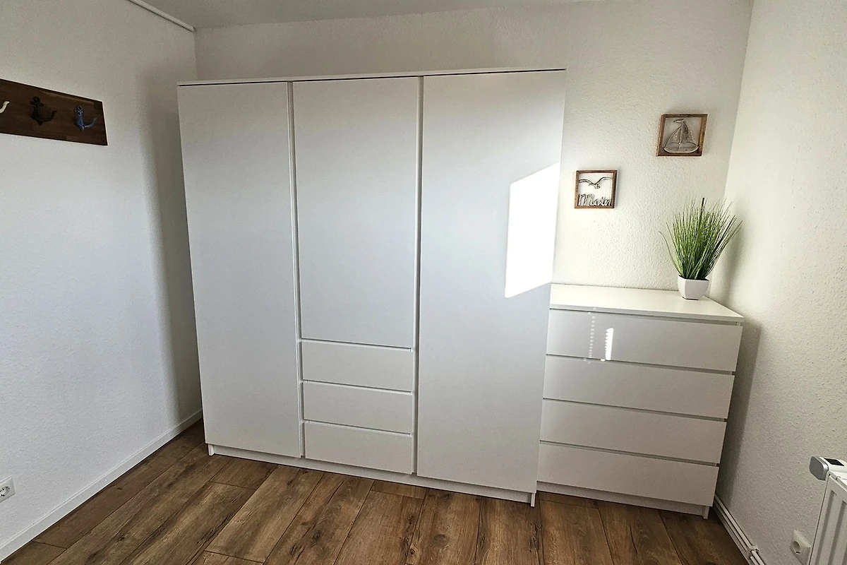 Als Schlafzimmer steht Ihnen ein Elternschlafzimmer mit einem Doppelbett und ein Kinderzimmer mit zwei Einzelbetten zur Verfügung. Die Betten bestehen aus Kaltschaummatratzen und einstellbaren Lattenrostrahmen. In beiden Schlafzimmern ist ein Kleiderschrank mit ausreichend Platz für Ihre Urlaubsgarderobe vorhanden. Für die kleinen Gäste ist ein Babyreisebett mit zusätzlicher Matratze, Kissen und Decke vorhanden.