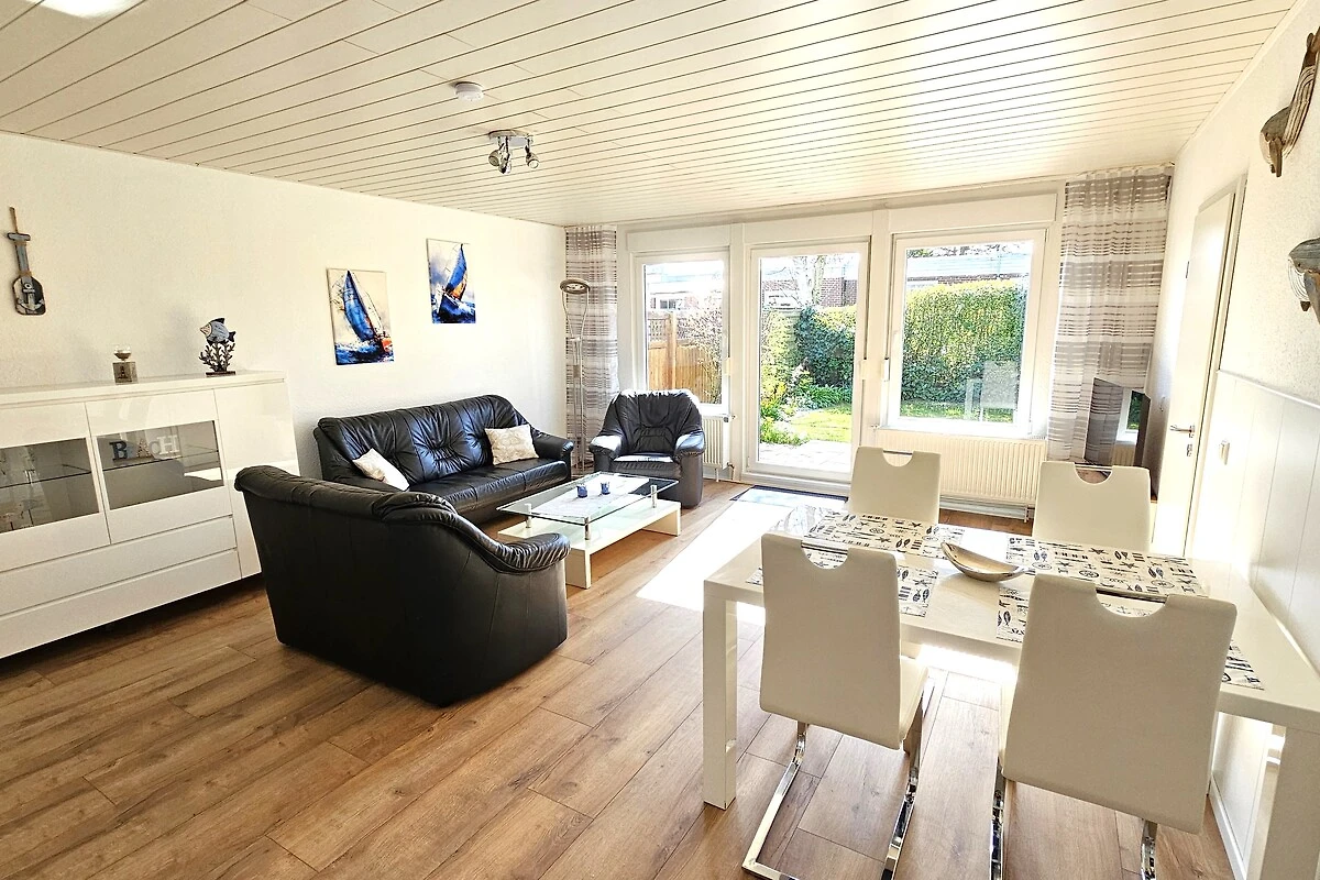 Das große gemütliche Wohnzimmer mit Essbereich bietet Ihnen die Möglichkeit bei Regenwetter einen schönen Abend zu verbringen. Die Ledergarnitur lädt super zum Spieleabend ein oder auch zum Entspannen. Durch den TV können Sie tolle Filme schauen. Zusätzlich gibt es im Wohnbereich den Zugang zu Terrasse mit Südwest-Ausrichtung. Dort können Sie auf den bequemen Gartenmöbeln und elektrischer Markise an sonnigen Tagen schön Beisammensein und den Kindern zuschauen wie Sie im Garten spielen. Der Garten ist teilweise eingezäunt oder mit Hecken und Büschen umgeben. Ebenso sind hier auch auch Sonnenliegen vorhanden, falls Sie sich sonnen möchten. Ein Bollerwagen steht Ihnen ebenfalls im Gartenhaus zur Verfügung.