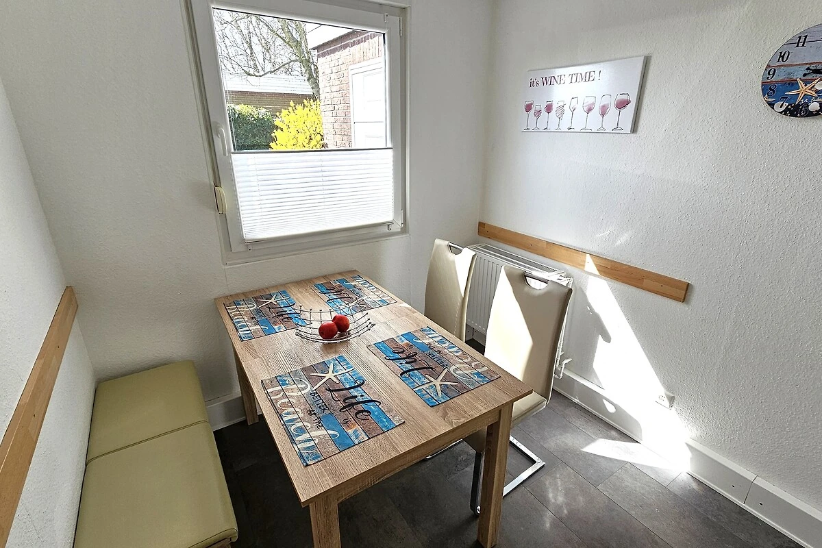 Die separate Küche mit Küchenzeile und einem kleinen Essbereich lädt zum gemeinsamen Kochen oder Backen und anschließenden genießen ein. Auch hier kommen die kleinen nicht zu kurz, ein Hochstuhl ist vorhanden. Ein Herd mit Ceranfeld und Backofen, eine Mikrowelle, den Kühlschrank, eine Kaffeemaschine, den Wasserkocher, den Toaster, den Eierkocher, den Handmixer und ausreichend Koch- und Essgeschirr runden die Küchenausstattung ab.