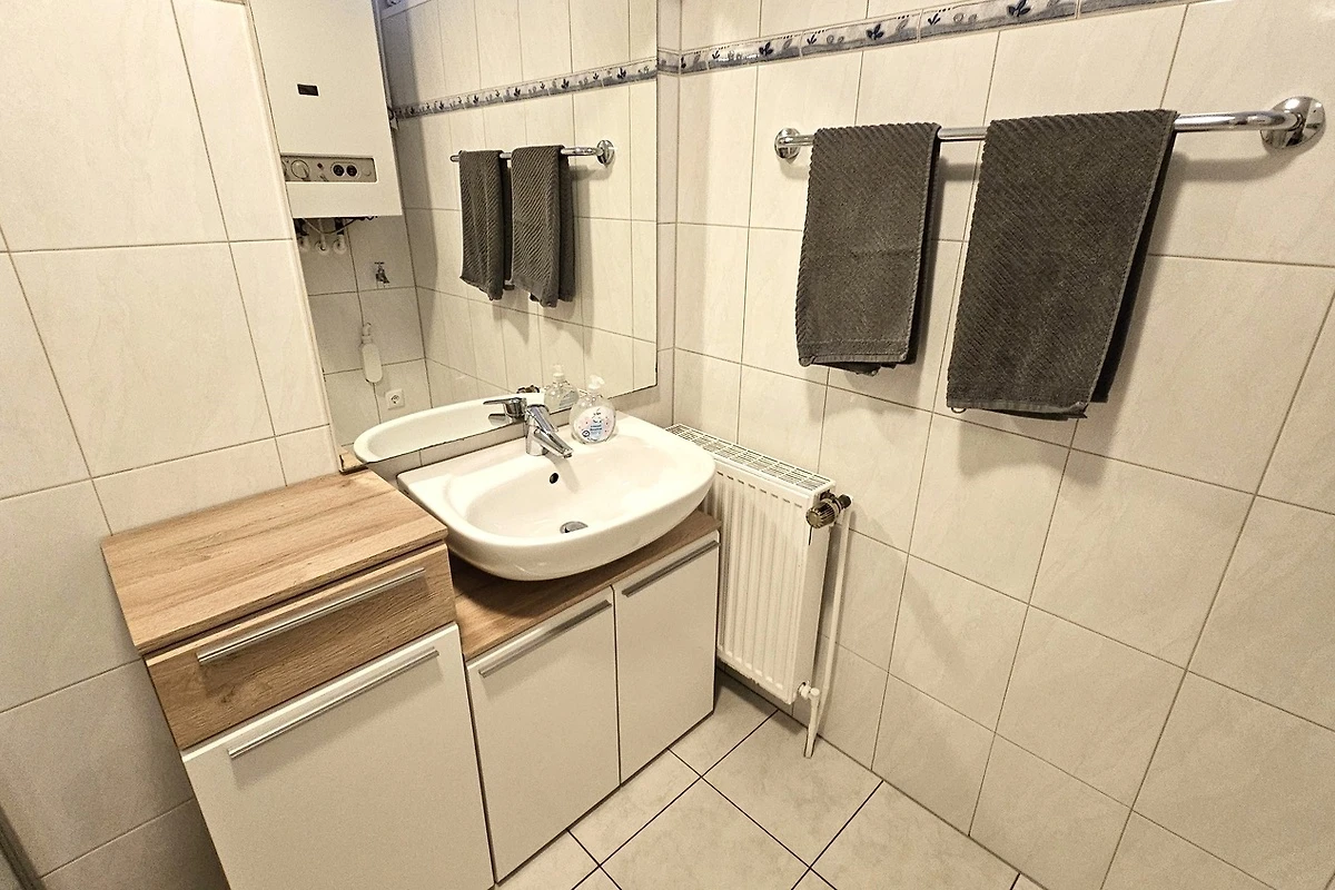 Das Tageslicht- Badezimmer verfügt über eine helle Einrichtung bestehend aus Waschbecken, Toilette und Dusche mit niedrigem Einstieg .