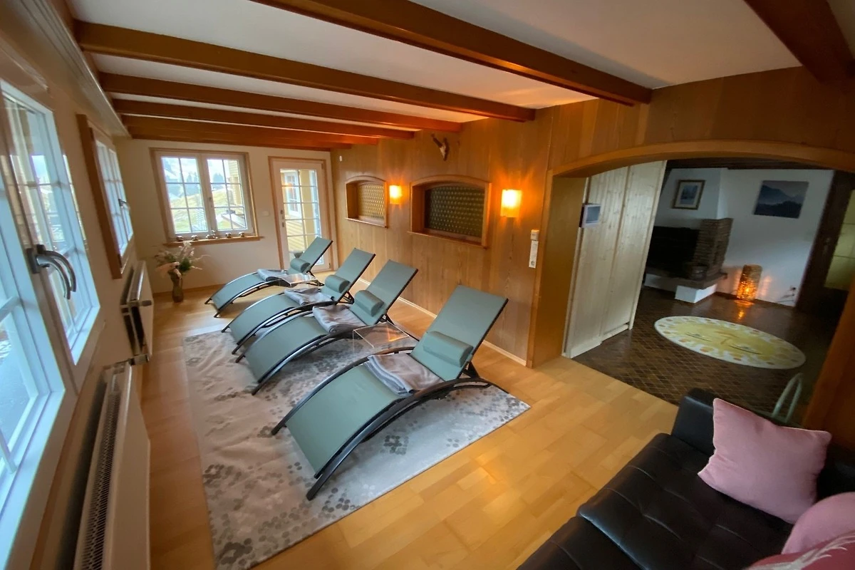 The garden has a climbing frame and a table tennis table. Each apartment has a terrace with garden furniture for breakfast or "Z'obig" (evening meal) in the open air. The centerpiece of the south-facing garden is the sun terrace with sun loungers and a view of the Swiss Alps.
