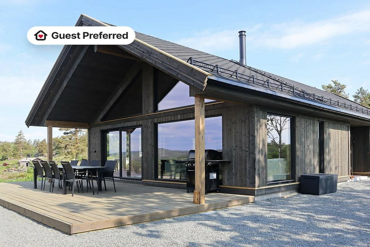 Geräumiges Ferienhaus mit Panoramaaussicht zum See Skarvannet! Hier können Sie die Natur genießen, Beeren und Pilze suchen, baden und angeln sowie abends in der Sauna entspannen. Im Ferienhaus liegen 4 der Schlafzimmer in der unteren Etage, dazu 1 Schlafzimmer mit mehreren Betten und ein Spielzimmer mit TV in der oberen Etage. Das Schlafzimmer hat Dachschrägen und eine maximale Deckenhöhe von 195 cm. Es gibt eine offene Küche mit Kochinsel und fantastischem Panoramablick zum Wasser! Wohnzimmer mit Kamin, TV, außerdem zwei Badezimmer mit Regendusche und ein Gäste-WC. Freies WLAN, Chromecast und Apple TV im Haus. Zudem Auflademöglichkeit für Ihr E-Auto am Haus. Das komfortable Ferienhaus liegt ruhig inmitten der norwegischen Landschaft, in einem spärlich bebauten Hüttenfeld, nicht weit vom Meer entfernt. Auf der großen Terrasse können Sie den ganzen Tag die Sonne genießen. Eine passende Unterkunft für die Großfamilie oder Freunde. Unweit gibt es am See ein Badeufer, ideal um zu entspannen, baden und den Kindern beim Spielen zusehen. Mit der Øysang-Fähre, in ca. 3 km Entfernung, gelangen Sie sicher nach Risør, der weißen Stadt am Skagerak, wo es viele Feste und Veranstaltungen gibt. Im Sommer finden Konzerte auf Stangholmen statt, einer kleinen Insel vor der Stadt. Die Anreise erreichen Sie mit dem Taxiboot, das Sie auch gerne zu den spannendsten Orten des Bezirks bringt. Bei Øysang haben Sie die Möglichkeit, ein Boot zu mieten, um den Fjord auf eigene Faust zu erkunden und spannende Angelausflüge auf dem See zu unternehmen. Im Winter gibt es tolle Möglichkeiten zum Eislaufen und Eisfischen sowohl am Skarvannet als auch im Fjord sowie zum Langlaufen auf der beleuchteten Loipe bei Søndeled. Besuchen Sie gerne das Ski- und Aktivitätszentrum Vegårshei (33 km) mit Skilift und Rodelbahn oder genießen Sie einfach die schöne Winterlandschaft. Im Ferienzentrum Jegertunet (5 km) gibt es ein Restaurant, einen Kiosk und ein Einrichtungsgeschäft sowie Tennisplätze und einen großen, schönen Spielplatz. In Stabbestad (24 km) gibt es ein Kurhotel und einen Golfplatz sowie Minigolfanlagen, und am Wasser gibt es einen Strandclub, ein Hafenbad und einen Kajakverleih am Fjord. „Den lille Dyrehage“ auf Brokeland Heia mit Norwegens größtem Regenwald ist nicht weit entfernt (24 km). Empfehlenswert ist auch ein Besuch der gemütlichen südlichen Dörfer Kragerø im Norden und Tvedestrand im Süden.