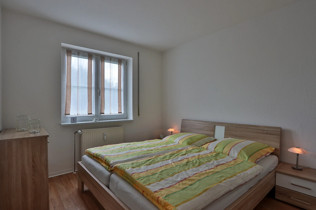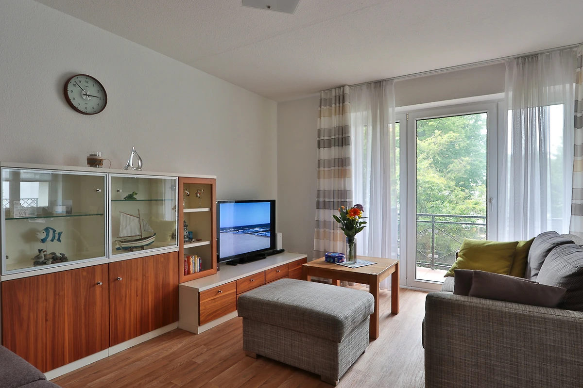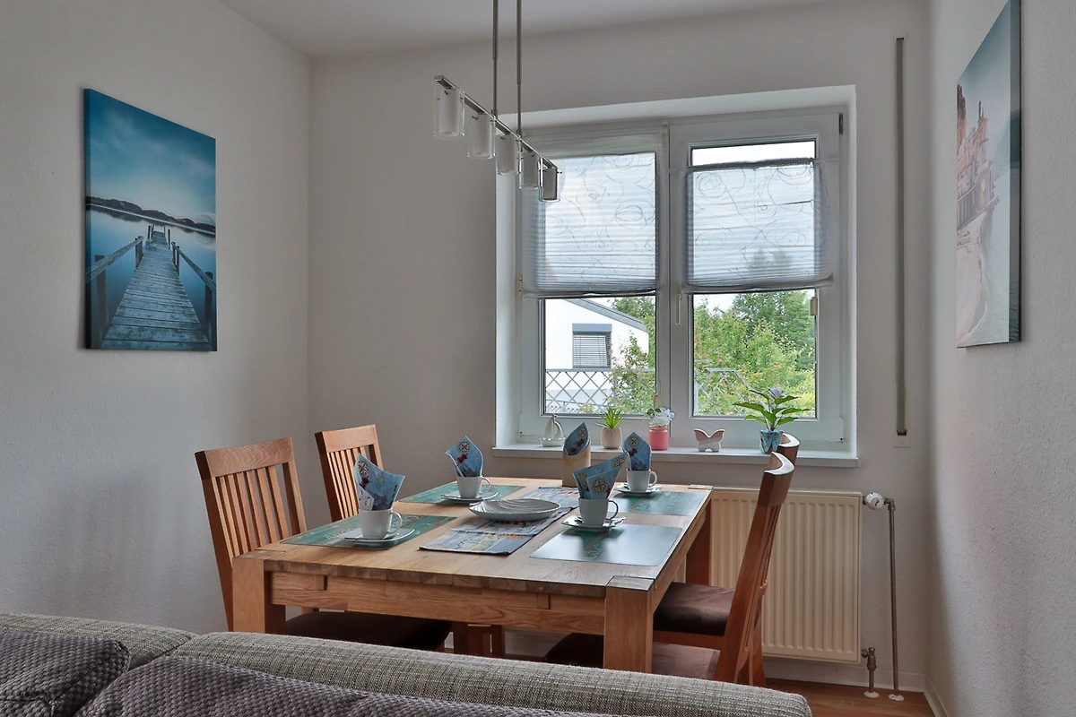 Diese komfortabel und gemütlich eingerichtete Wohnung Uferschwalbe lädt zum Verweilen ein. Das Wohnzimmer ist ausgestattet mit einer Couch + einer sehr guten Doppelbettcouch, TV und Radio sowie einem Esstisch. Vom Balkon schauen Sie auf schöne alte Bäume. Das Schlafzimmer hat ein Doppelbett, Nachttische, Kommode und Kleiderschrank. Die separate Küche verfügt über alle modernen Geräte. Das Bad mit Fenster ist mit einer Badewanne und Waschmaschine ausgestattet. Alle Fenster der Wohnung haben Rollläden sowie Fliegengitter. Den Gästen stehen zwei 28-er Fahhräder kostenfrei zur Verfügung.