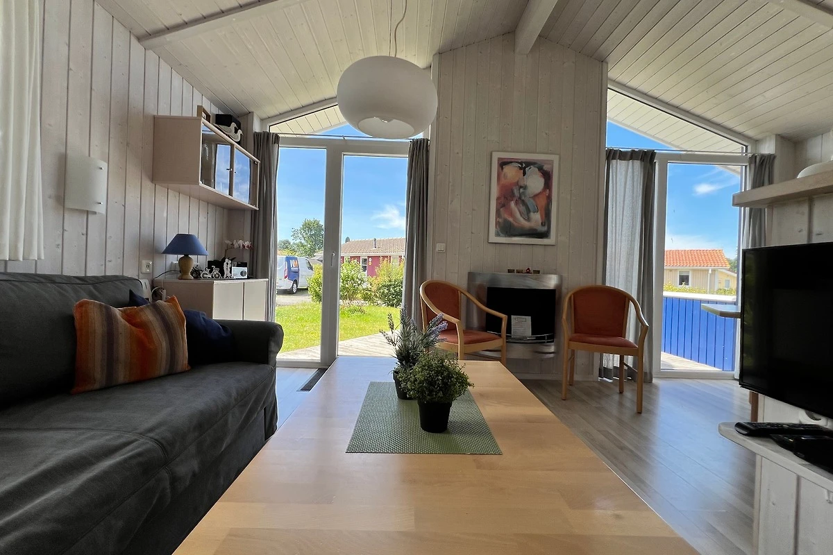 Die grossen Fenster lassen ein schönes Licht herein. Von hier aus haben Sie den Ausgang zur Terrasse. Ein funktionelles Ferienhaus, in dem sich alle wohl fühlen werden. Das Ferienhaus verfügt über einen kostenlosen Glasfaser-Anschluss.