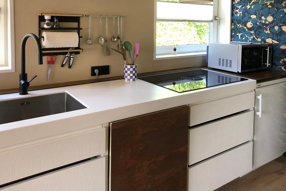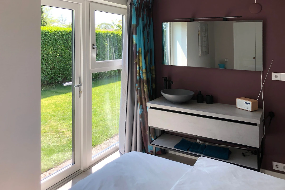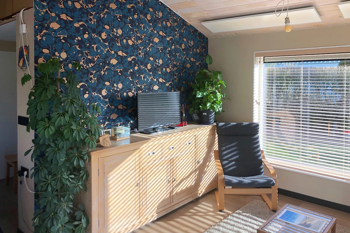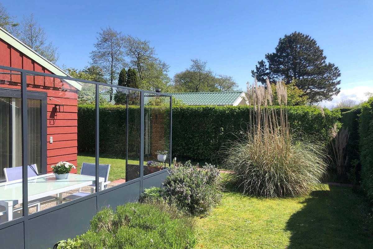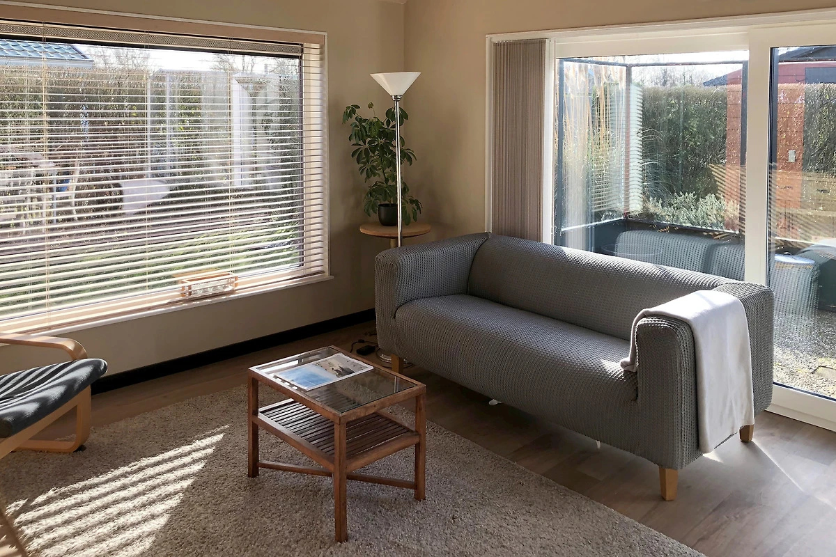 Das Ferienhaus SunGarden bietet mit seiner guten Ausstattung viel Komfort. Die Küche verfügt über eine Kombi-Mikrowelle und einen Geschirrspüler. Im Wohnzimmer steht ein Smart-TV, und die grossen Fenster lassen viel Tageslicht herein.