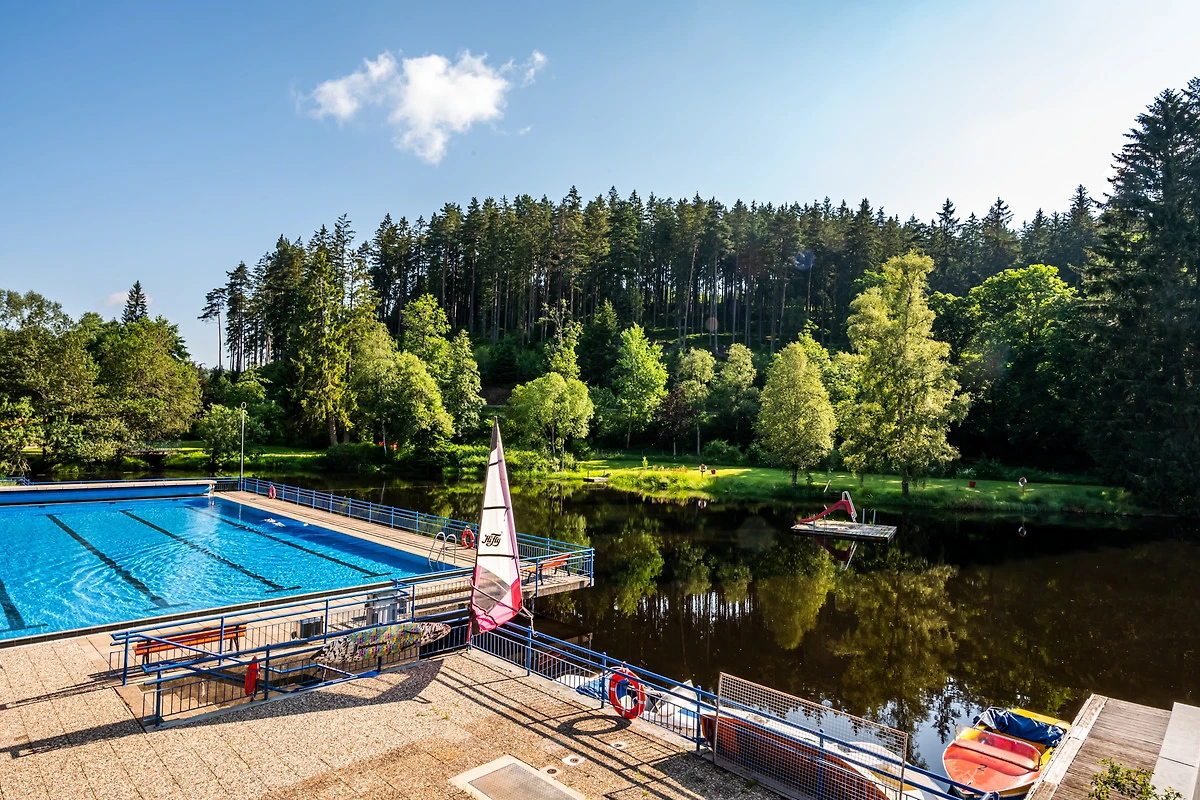The heated outdoor pool with bathing lake is just 500 metres from the accommodation. The spacious sunbathing lawn and the raft in the centre of the lake invite you to relax and sunbathe. The lake can also be explored with rowing boats or via a 3 metre diving board.