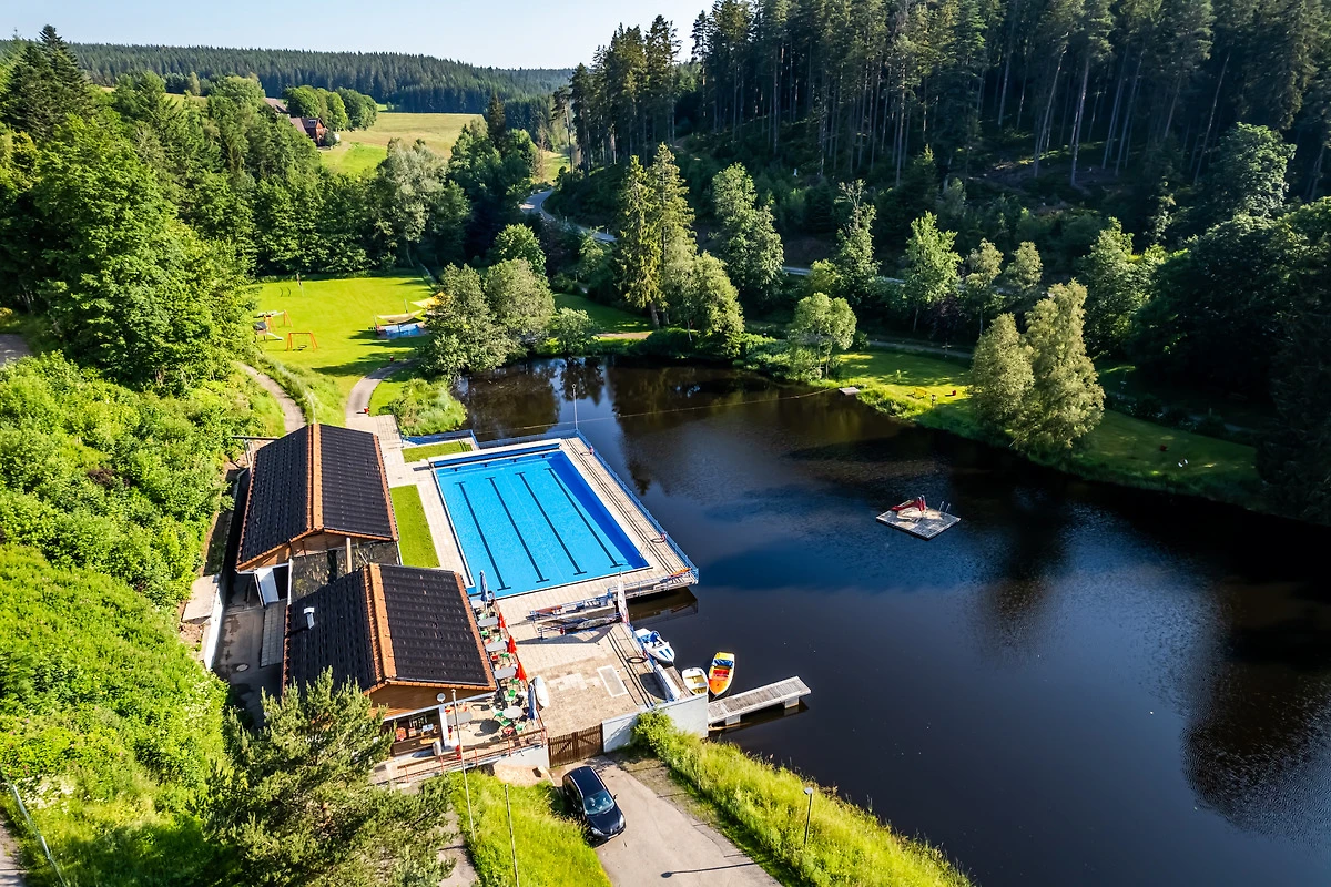 Nur 500m entfernt von der Unterkunft liegt das beheizte Freibad mit Badesee. Die grossezügige Liegewiese und das Floss in der Seemitte laden zum Ausruhen und Sonnenbaden ein. Der See kann auch mit Ruderbooten oder über ein 3 Meter-Sprungbrett erkundet werden.