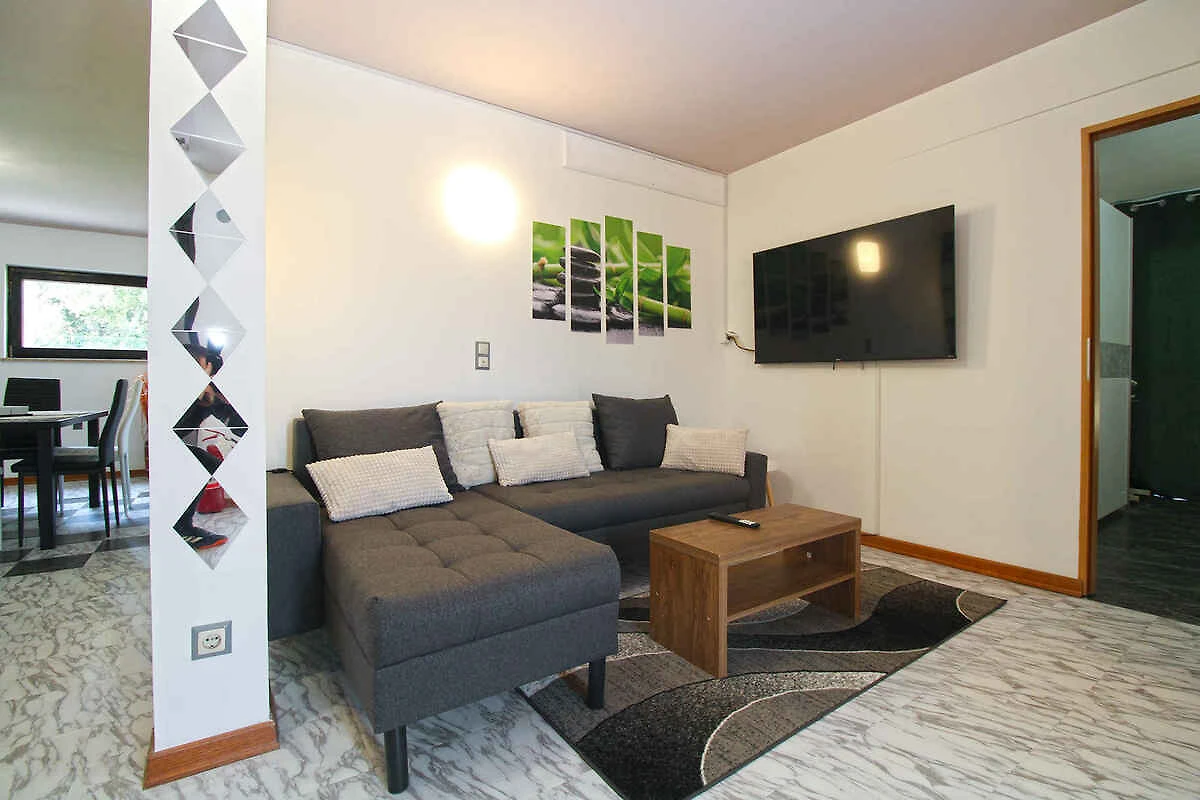 Wohnzimmer mit TV und Zugang zur Terrasse. 3 Schlafzimmer jeweils mit 1 Doppelbett. Kochnische mit Backofen, Kühlschrank (Eisfach), Kaffeemaschine und elektrischem Wasserkocher. Bad mit Badewanne, Waschmaschine, Dusche, WC und Föhn.