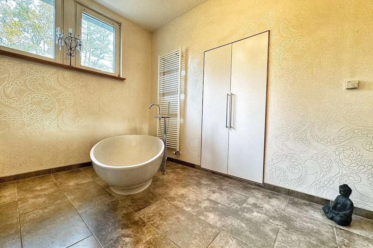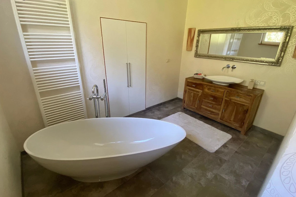 Schlafzimmer 1, direkter Zugang zu Bad mit freistehender Badewanne
