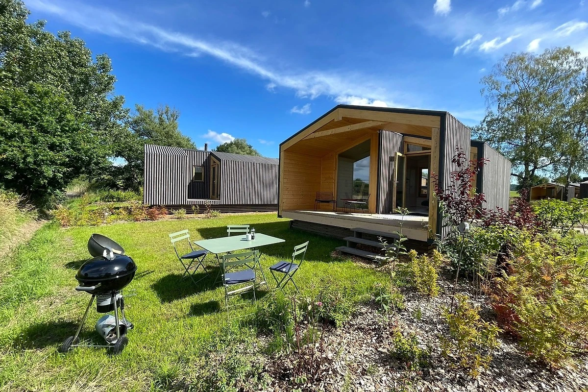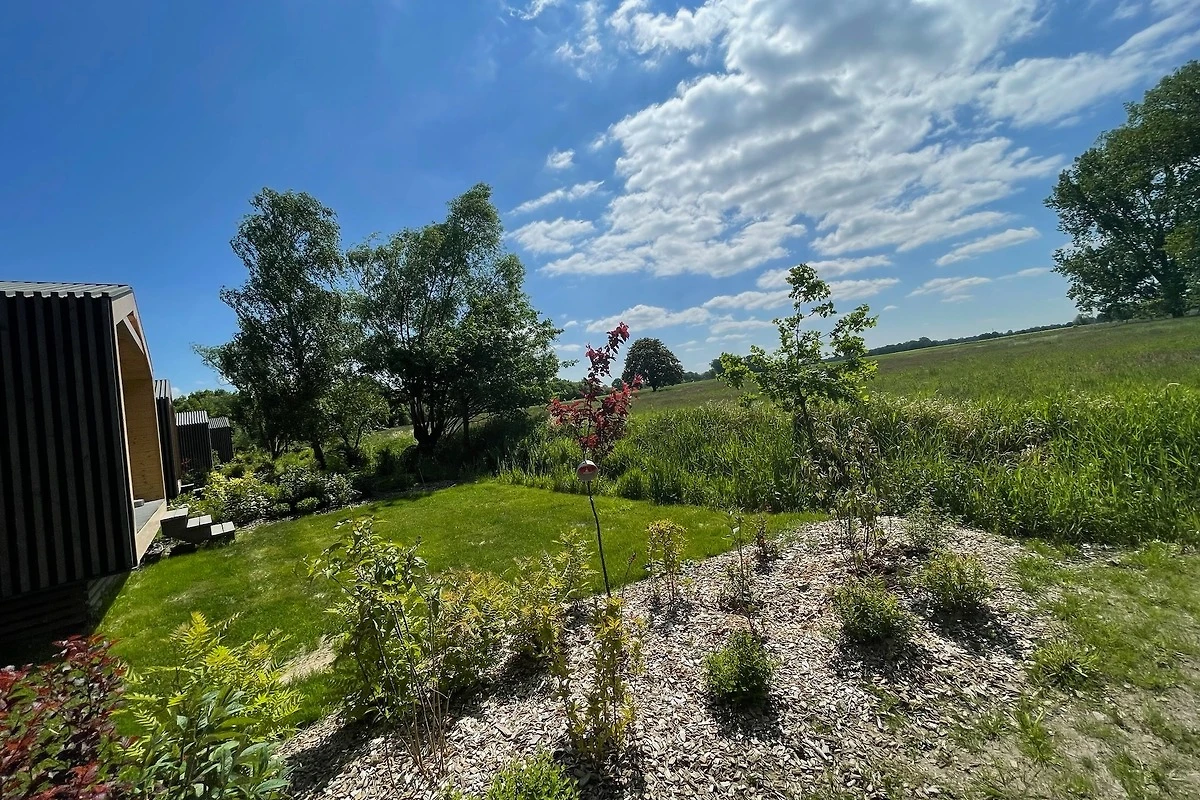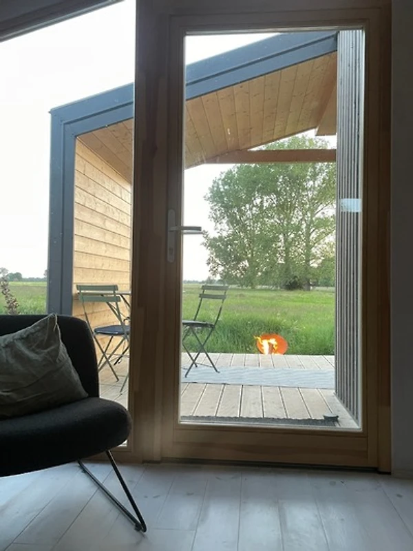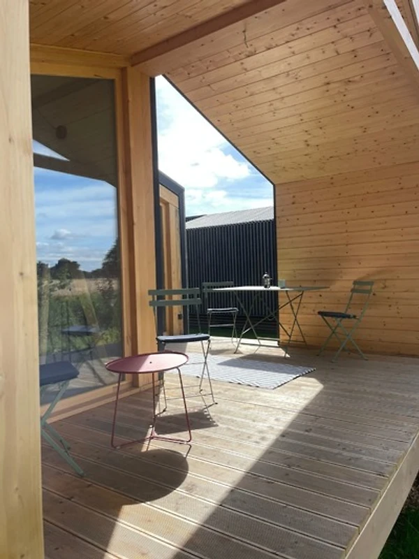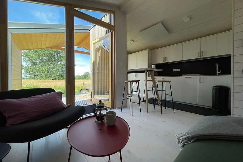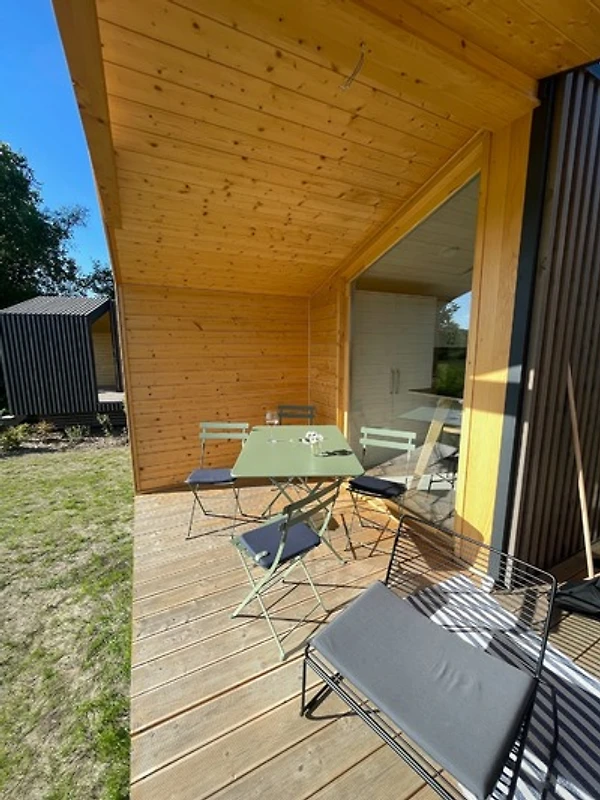 Es verfügt über eine voll ausgestattet Küche inkl. Geschirrspüler und Kombi-Mikrowellenofen, Duschbad mit Regendusche und Fussbodenheizung, einem Wohnraum mit einem herrlichen Blick durch die Panaromafenster in die grüne Natur sowie einer überdachten Holzterrasse mit unverbautem Blick. Im separaten Schlafzimmer befindet sich ein Doppelbett (160 x 200cm) mit viel Stauraum. Auf dem Schlafsofa (140 x 200cm) im Wohnraum können zwei weitere Personen schlafen.