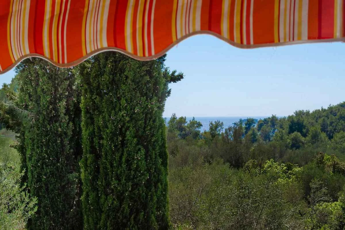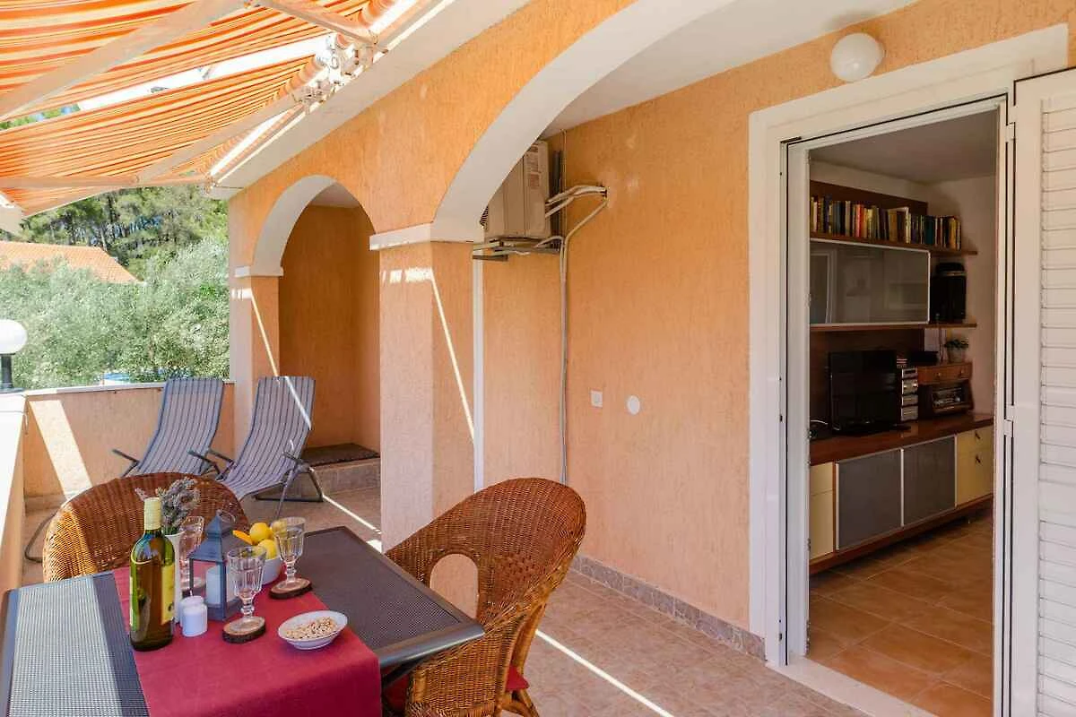 Vela Luka. Die Ferienwohnung befindet sich auf einem geschlossenen Gartengrundstück, von einem Zaun und einer Mauer begrenzt. Der Vermieter wohnt im Haus. Die Zufahrt erfolgt über eine Nebenstrasse. Parkplatz auf der Strasse vor dem Haus.