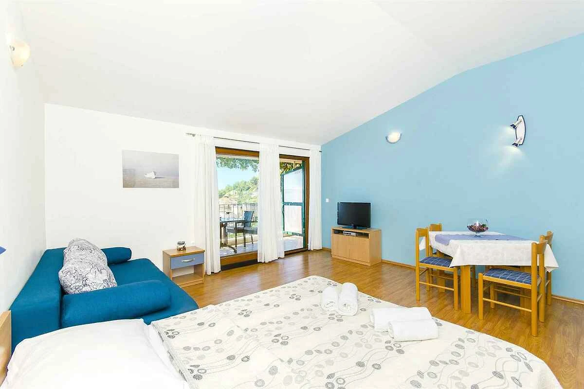 Das Studio befindet sich in einem Apartementhaus und ist zweckmässig eingerichtet. Das Grundstück liegt am Ortsrand. Auch wegen des Ausblicks vom Grundstück auf das Meer und der sonnigen Lage ist das Domizil beliebt.