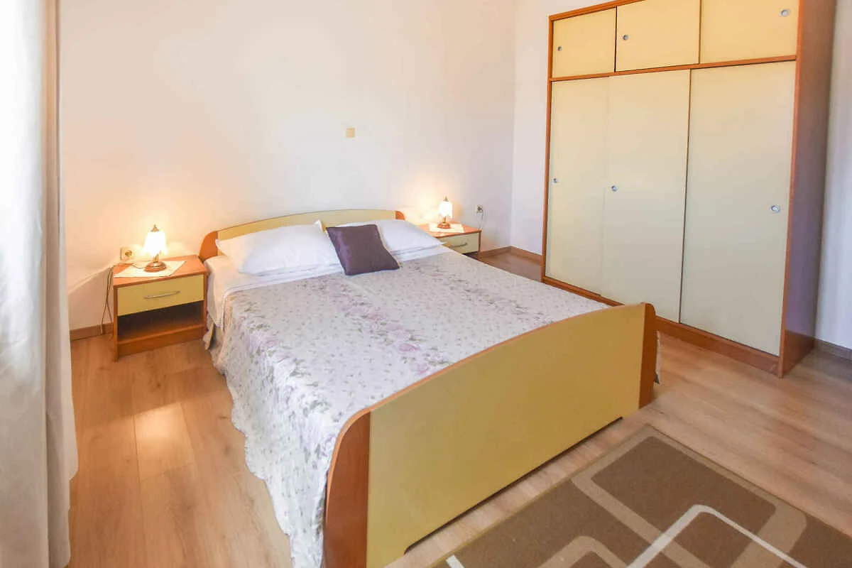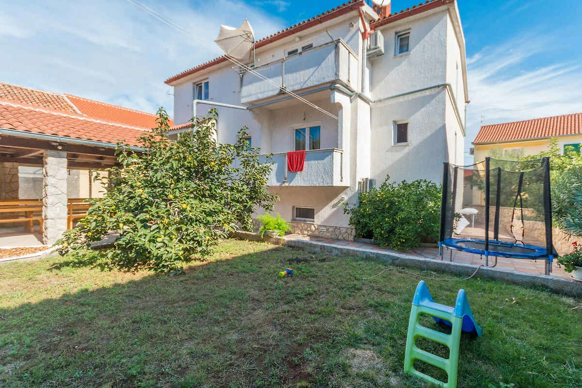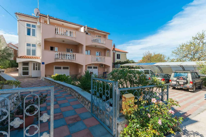 Pašman. Die Ferienwohnung befindet sich auf einem geschlossenen Gartengrundstück mit Blumen und Bäumen, von einem Zaun begrenzt. Die Zufahrt erfolgt über eine Nebenstrasse (asphaltiert). Parkplatz auf dem Grundstück.