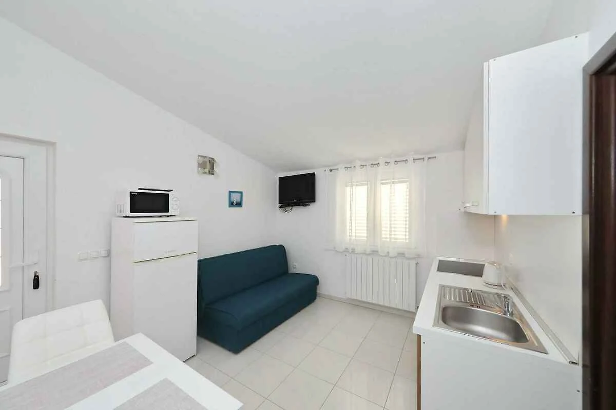 Kraj/Insel Pašman. Die Ferienwohnung befindet sich auf einem geschlossenen Gartengrundstück mit Blumen und Bäumen, von einem Zaun begrenzt. Die Zufahrt erfolgt über eine Nebenstrasse (asphaltiert). Parkplatz auf dem Grundstück.