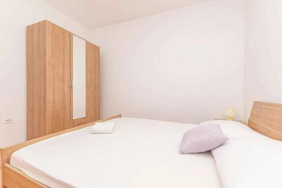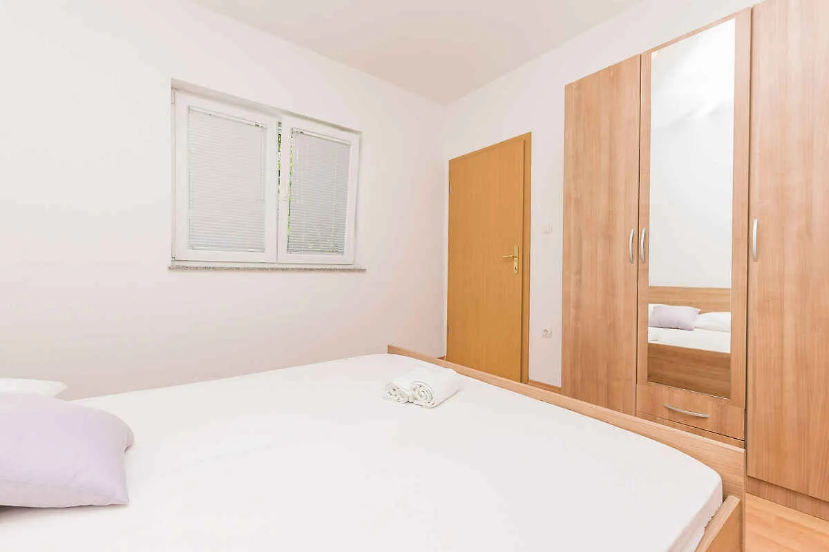 Pirovac. Die Ferienwohnung befindet sich auf einem geschlossenen Gartengrundstück mit Blumen und Bäumen, von einem Zaun begrenzt. Die Zufahrt erfolgt über eine Nebenstrasse (asphaltiert). Parkplatz auf dem Grundstück.