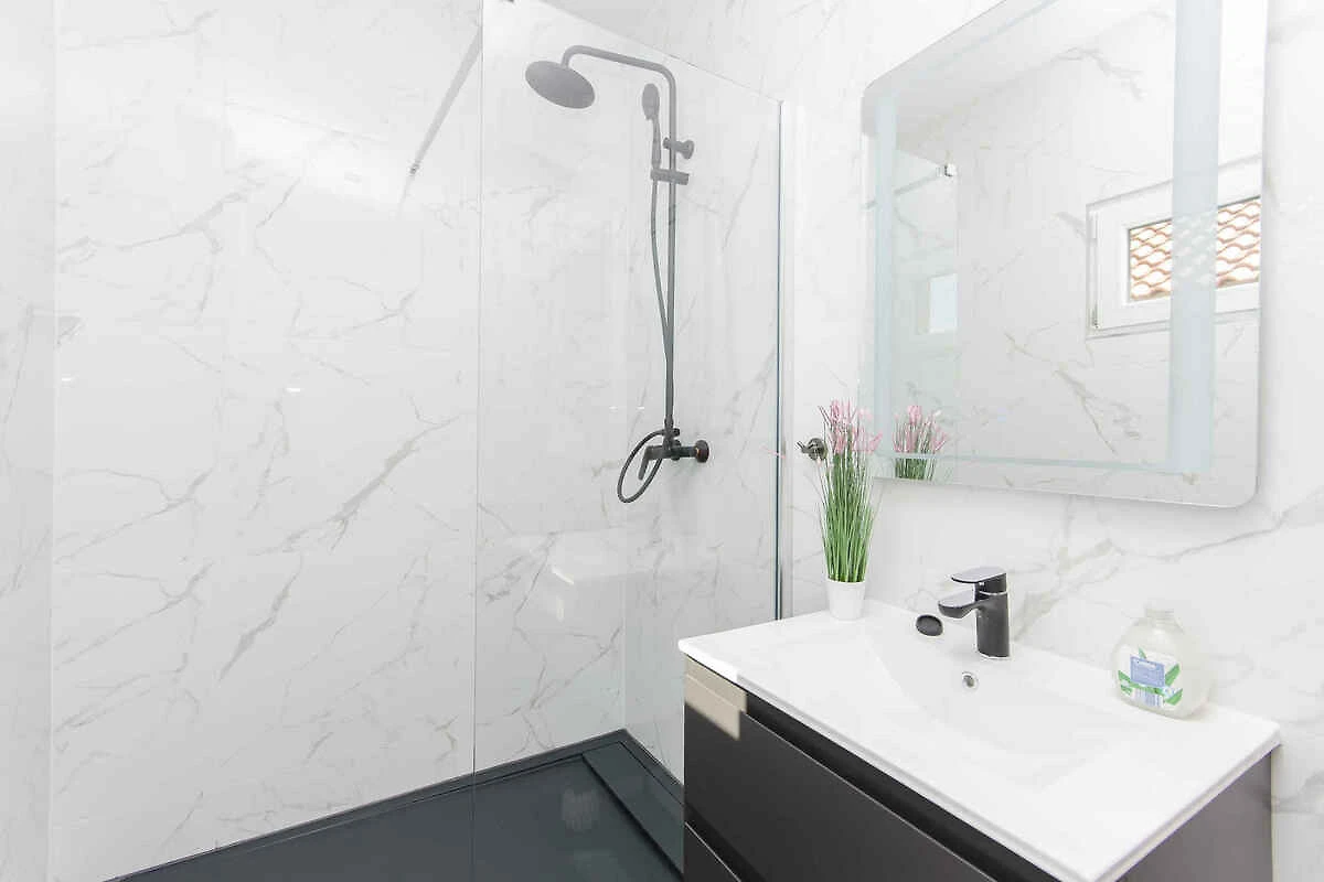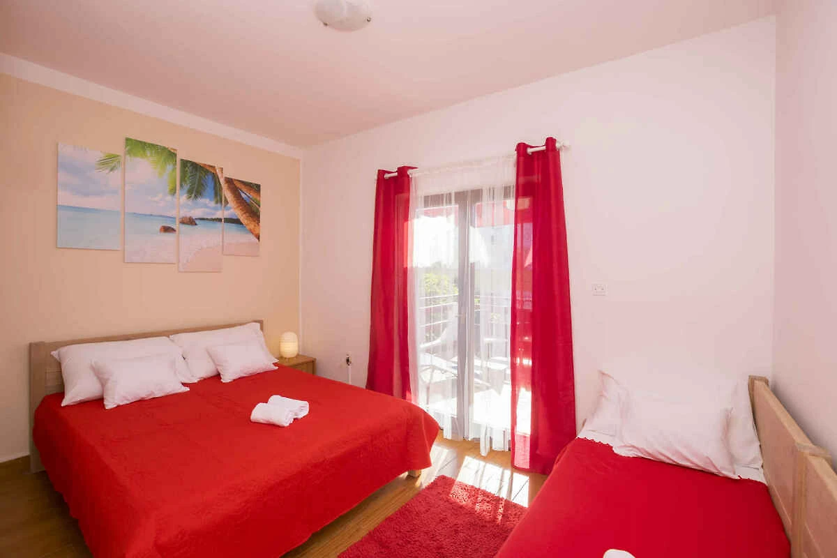 Pirovac. Die Ferienwohnung befindet sich auf einem geschlossenen Gartengrundstück mit Blumen und Bäumen, von einem Zaun begrenzt. Die Zufahrt erfolgt über eine Nebenstrasse (asphaltiert). Parkplatz auf dem Grundstück.