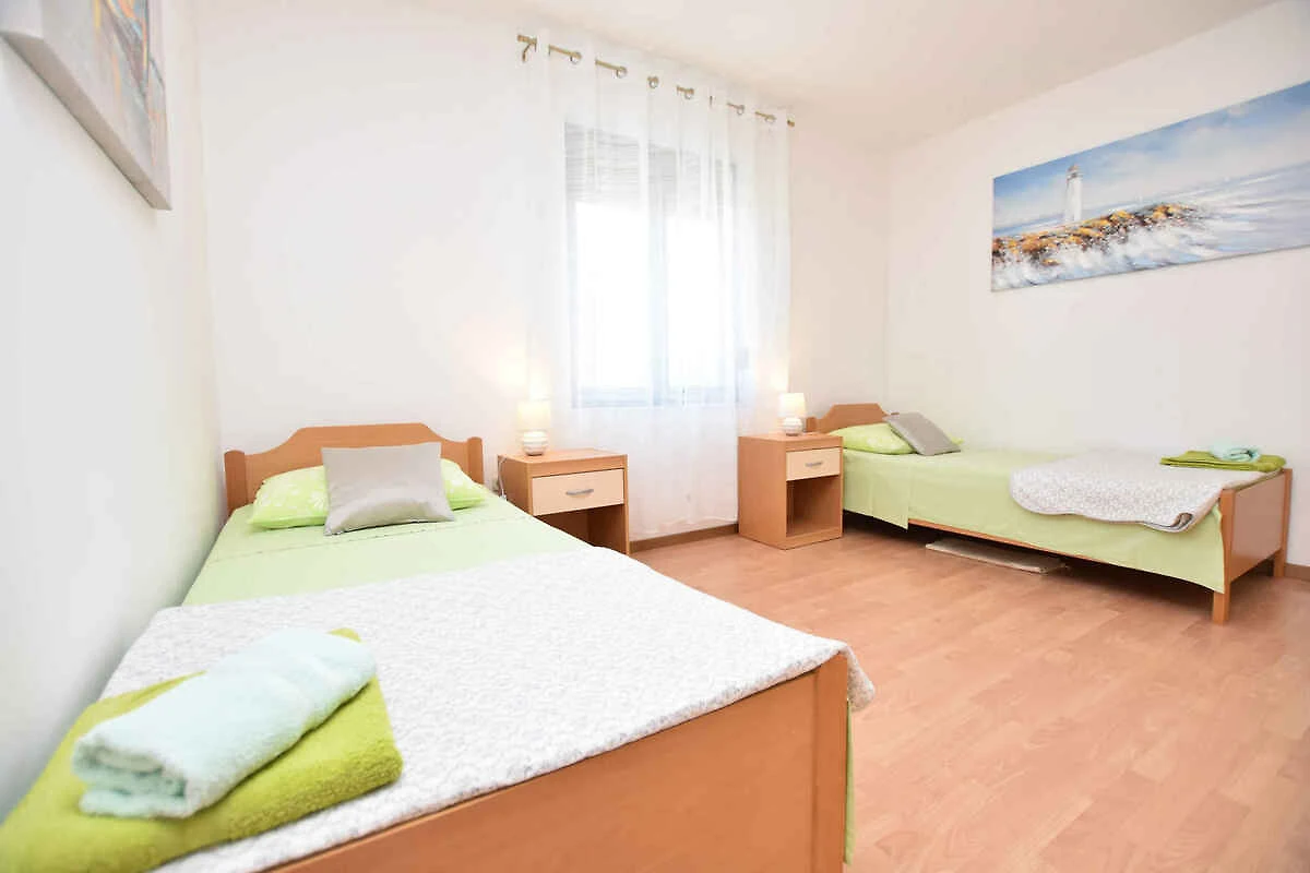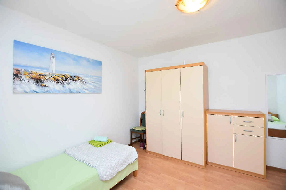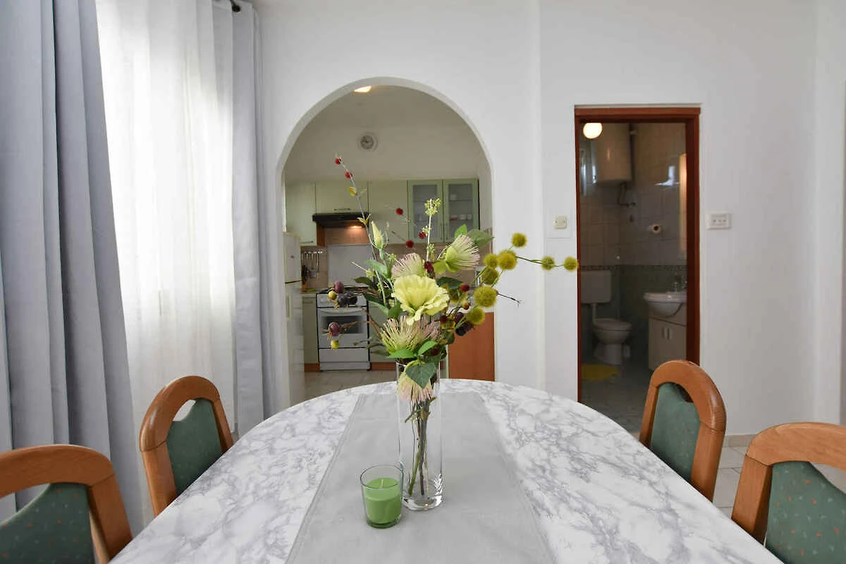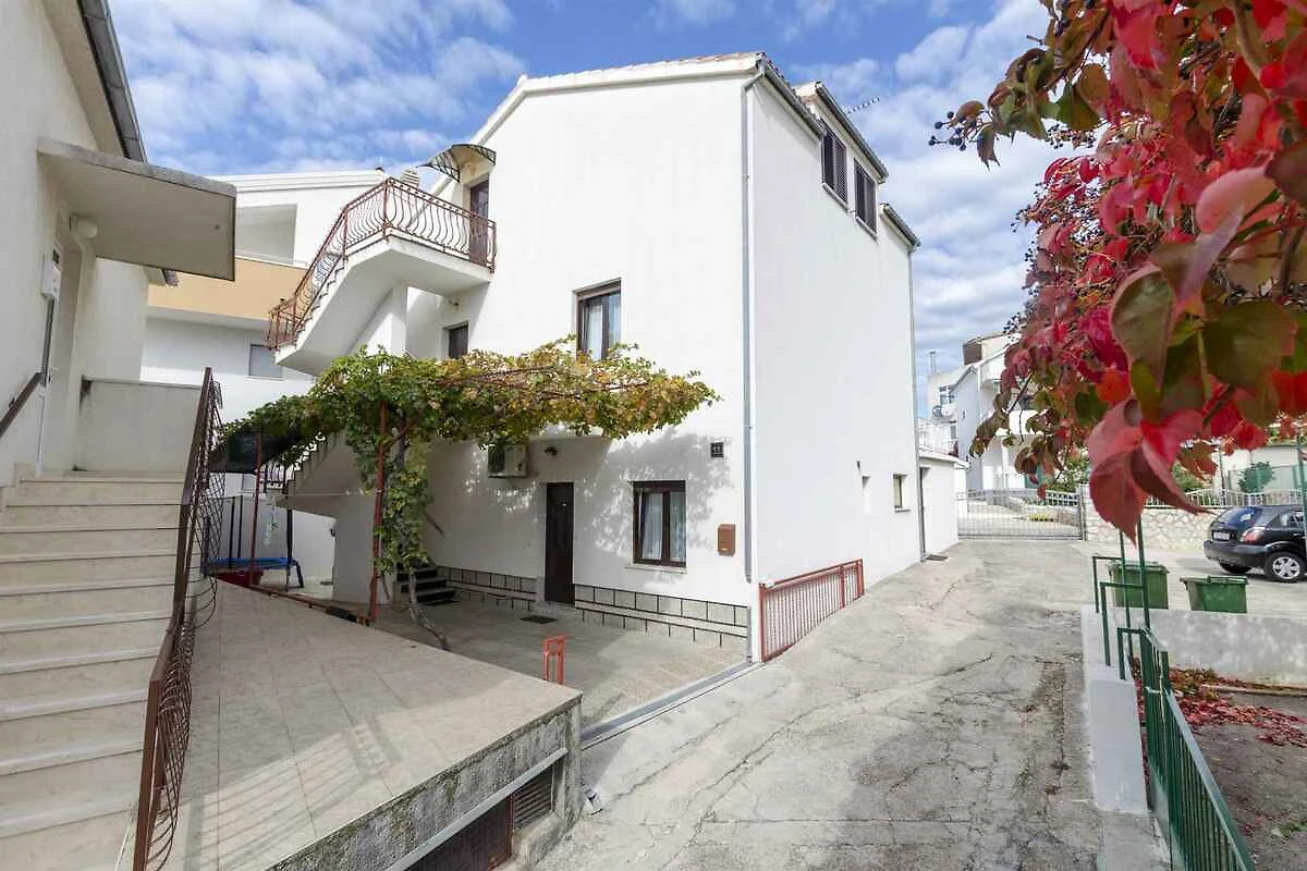Primošten. Die Ferienwohnung befindet sich auf einem geschlossenen Gartengrundstück mit Blumen und Bäumen, von einem Zaun begrenzt. Der Vermieter wohnt ständig im Haus. Ausblick den Hof. Die Zufahrt erfolgt über eine Nebenstrasse (asphaltiert). Parkplatz auf der Strasse vor dem Haus.