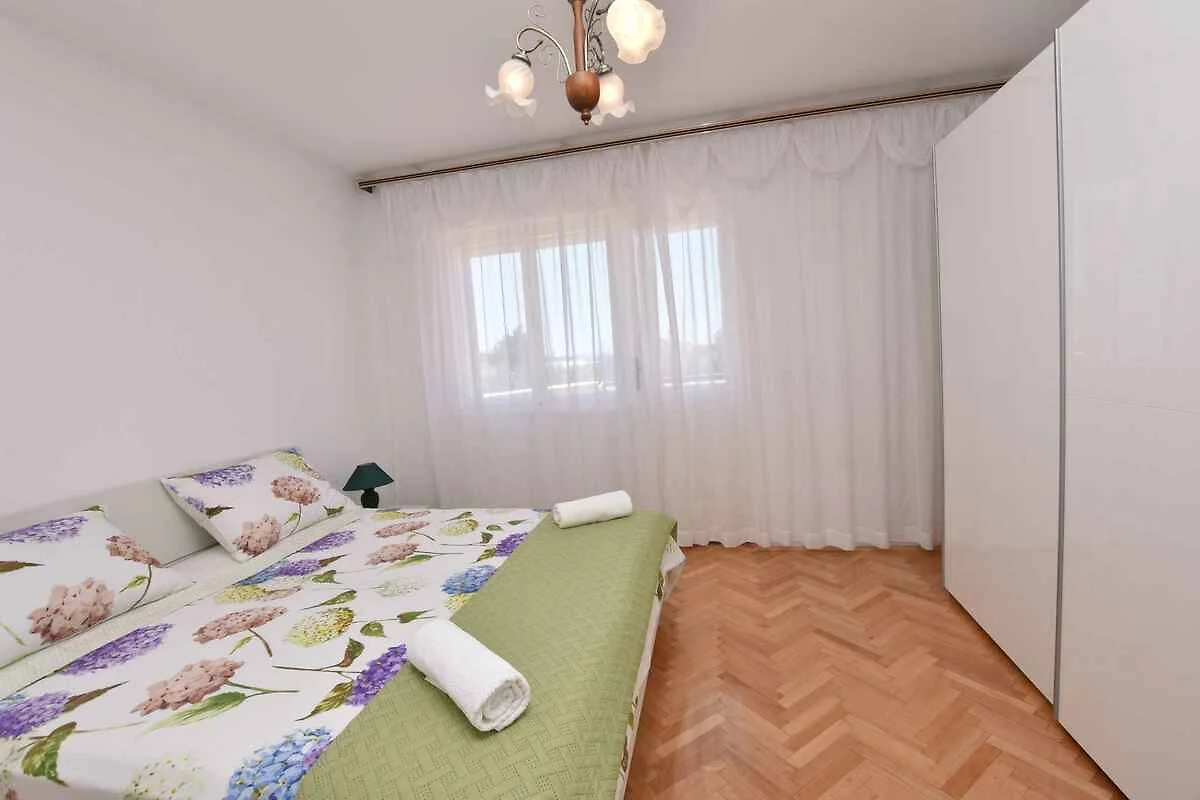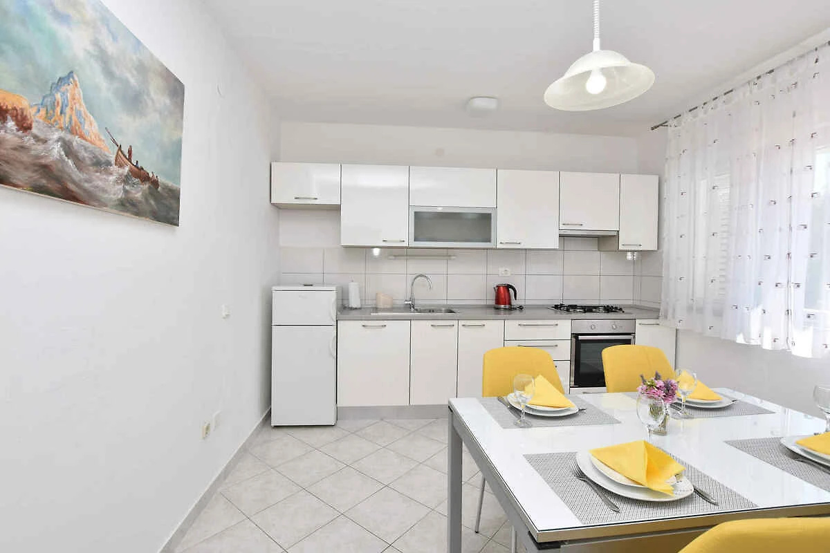 Primošten. Die Ferienwohnung befindet sich auf einem geschlossenen Gartengrundstück mit Blumen und Bäumen, von einer Mauer begrenzt. Der Vermieter wohnt ständig im Haus. Ausblick die Grünfläche und den Hof. Die Zufahrt erfolgt über eine Nebenstrasse (asphaltiert). Parkplatz auf der Strasse vor dem Haus.