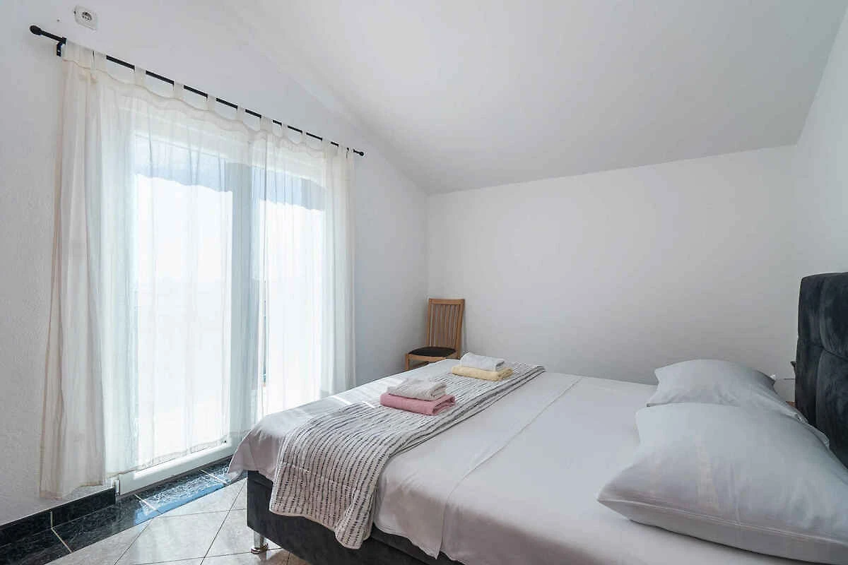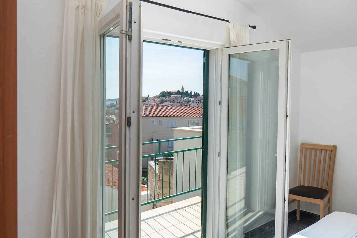 Primošten. Die Ferienwohnung befindet sich auf einem geschlossenen Gartengrundstück mit Blumen und Bäumen, von einer Mauer begrenzt. Der Vermieter wohnt im Haus. Ausblick auf das Meer. Die Zufahrt erfolgt über eine Nebenstrasse (asphaltiert). Parkplatz auf der Strasse vor dem Haus.