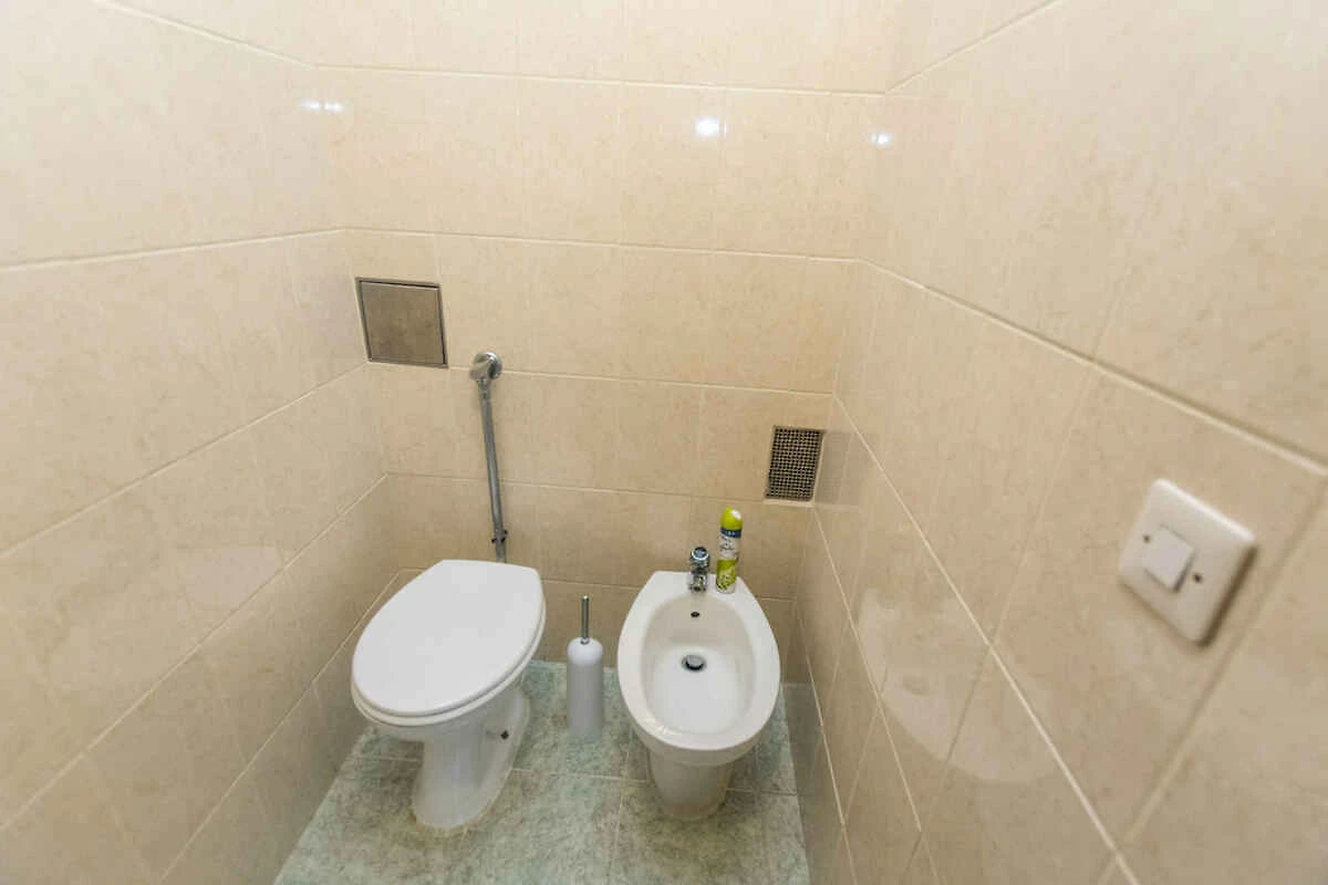 und ist ebenerdig. Wohnzimmer (Durchgangszimmer) mit Essecke (4 Plätze). Schlafzimmer (10 qm) mit 1 Doppelbett und Zugang zum Balkon (6 qm, Gartenmöbel, 1 Tisch, 2 Stühle). Schlafzimmer (10 qm) mit 1 Doppelbett und Zugang zum Balkon (6 qm). Kochecke im Wohnzimmer mit Gasherd, Backofen, Dunstabzugshaube und Kühlschrank (Eisfach). Bad mit Badewanne, 1 Waschbecken und Fenster. Separates WC mit WC und Bidet.