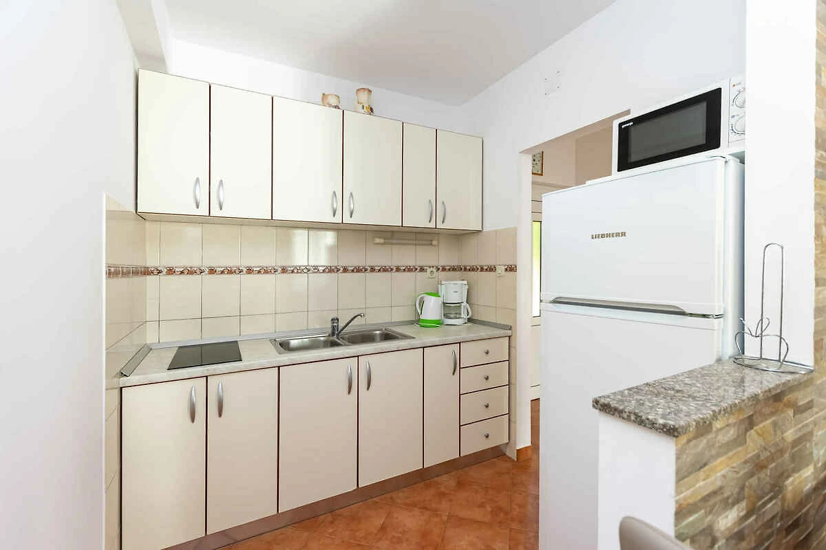 Wohnzimmer mit 1 Zusatzbett auf Couch/Sofa, Sitzecke, TV und Essecke (4 Plätze). Schlafzimmer (12 qm) mit 1 Doppelbett und Zugang zur Terrasse. Kochnische im Wohnzimmer mit Elektroherd (2 Platten), Kühlschrank (Eisfach), Mikrowelle und Kaffeemaschine. Bad mit Waschmaschine, Dusche, WC und Fenster.