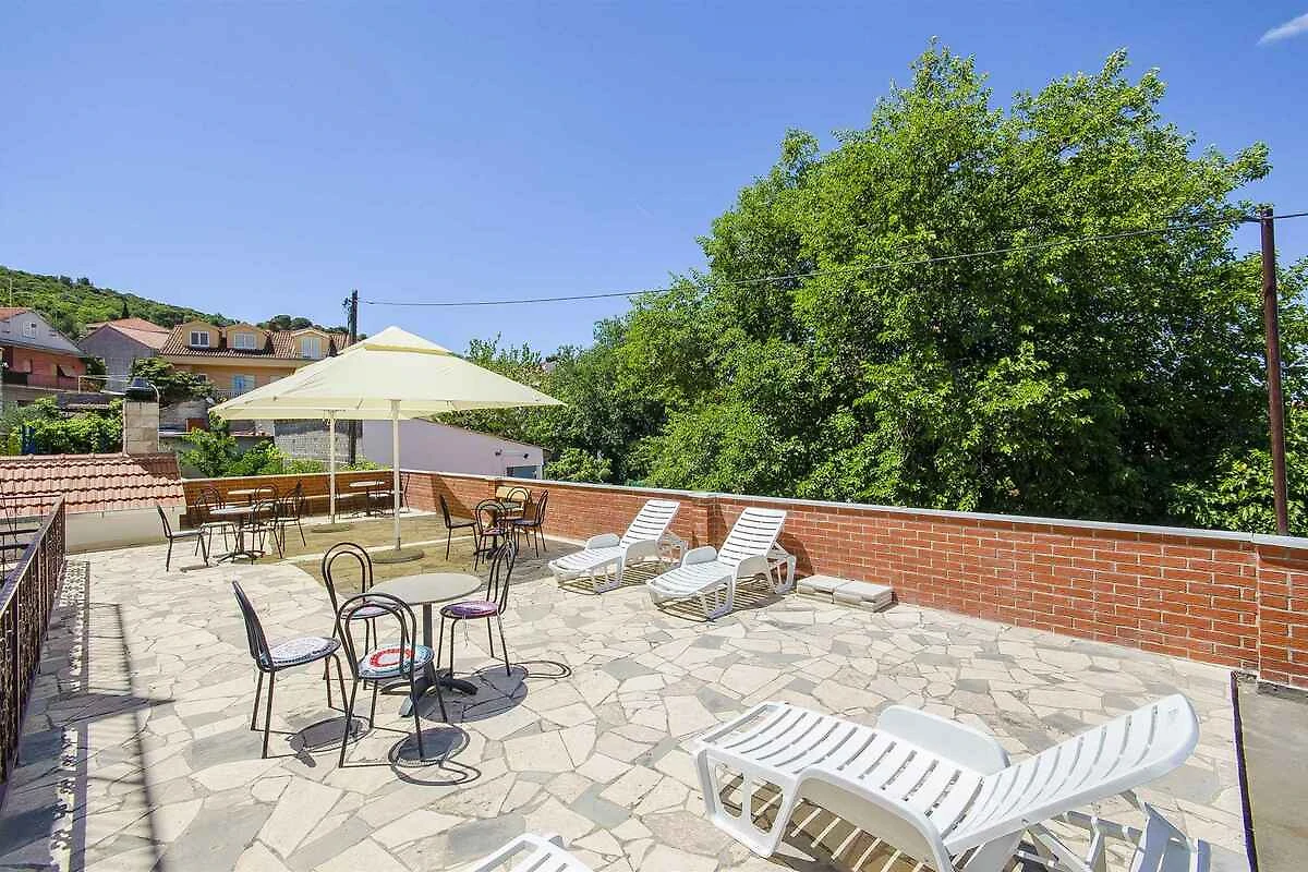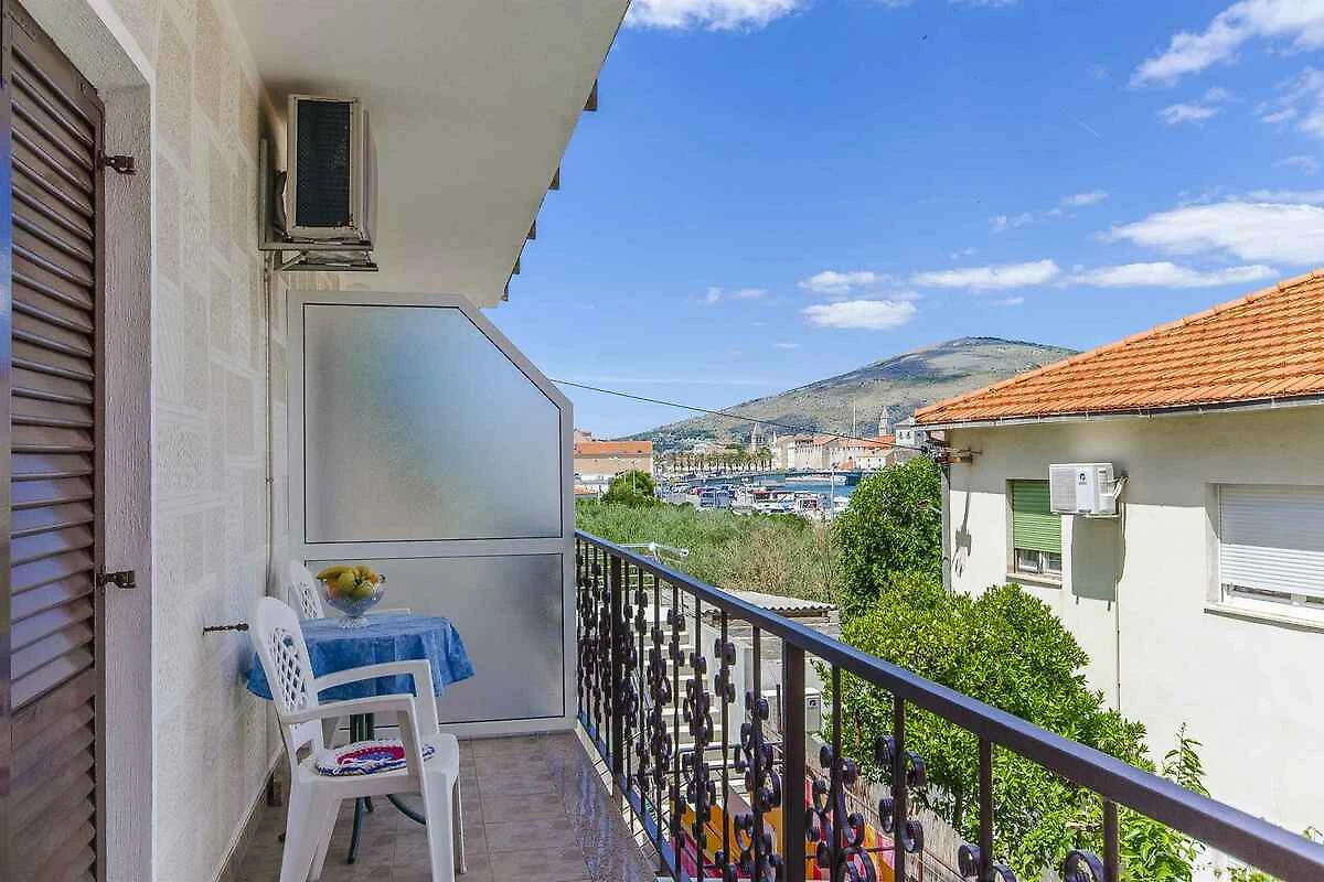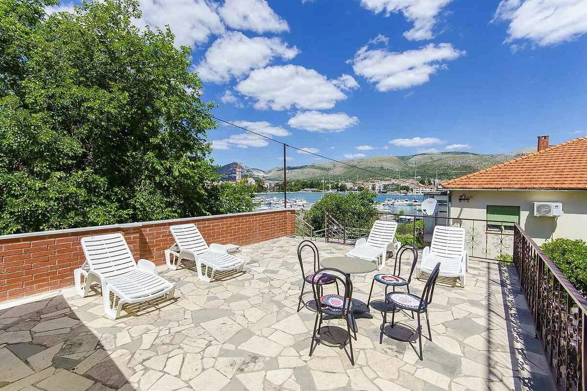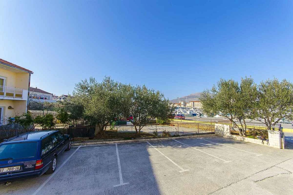 Trogir. Die Ferienwohnung befindet sich auf einem geschlossenen Gartengrundstück, von einem Zaun und einer Mauer begrenzt. Der Vermieter wohnt im Haus. Aussicht: Meer und ruhige Strasse. Die Zufahrt erfolgt über eine Nebenstrasse. Parkplatz auf dem Grundstück.