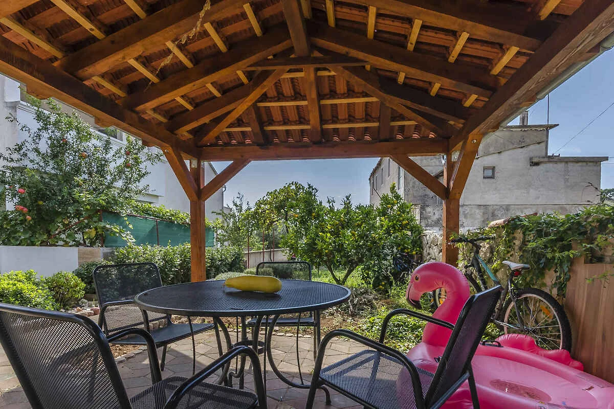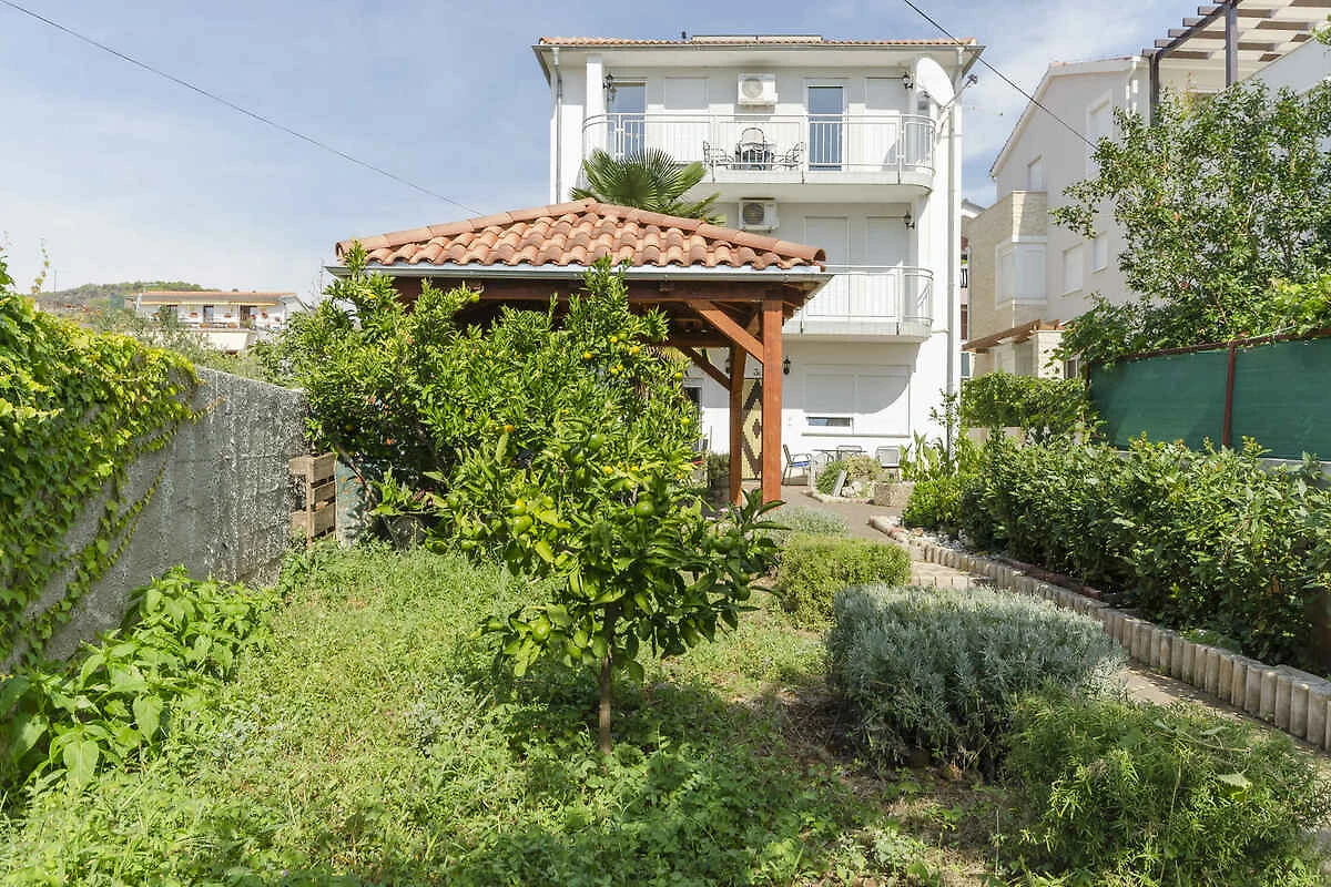 Tribunj. Die Ferienwohnung befindet sich auf einem geschlossenen Gartengrundstück mit Wiese und Bäumen, von einer Mauer begrenzt. Der Vermieter wohnt nur zeitweise im Haus. and Tribune. Die Zufahrt erfolgt über eine Nebenstrasse (asphaltiert). Parkplatz in Carport.