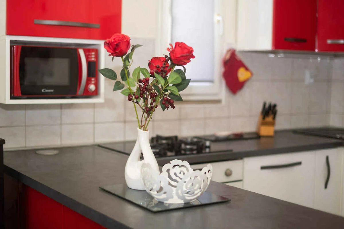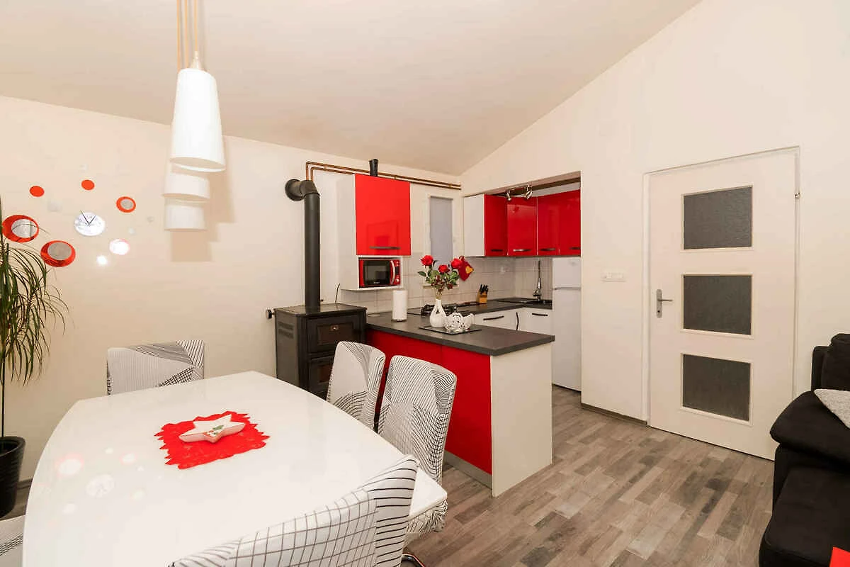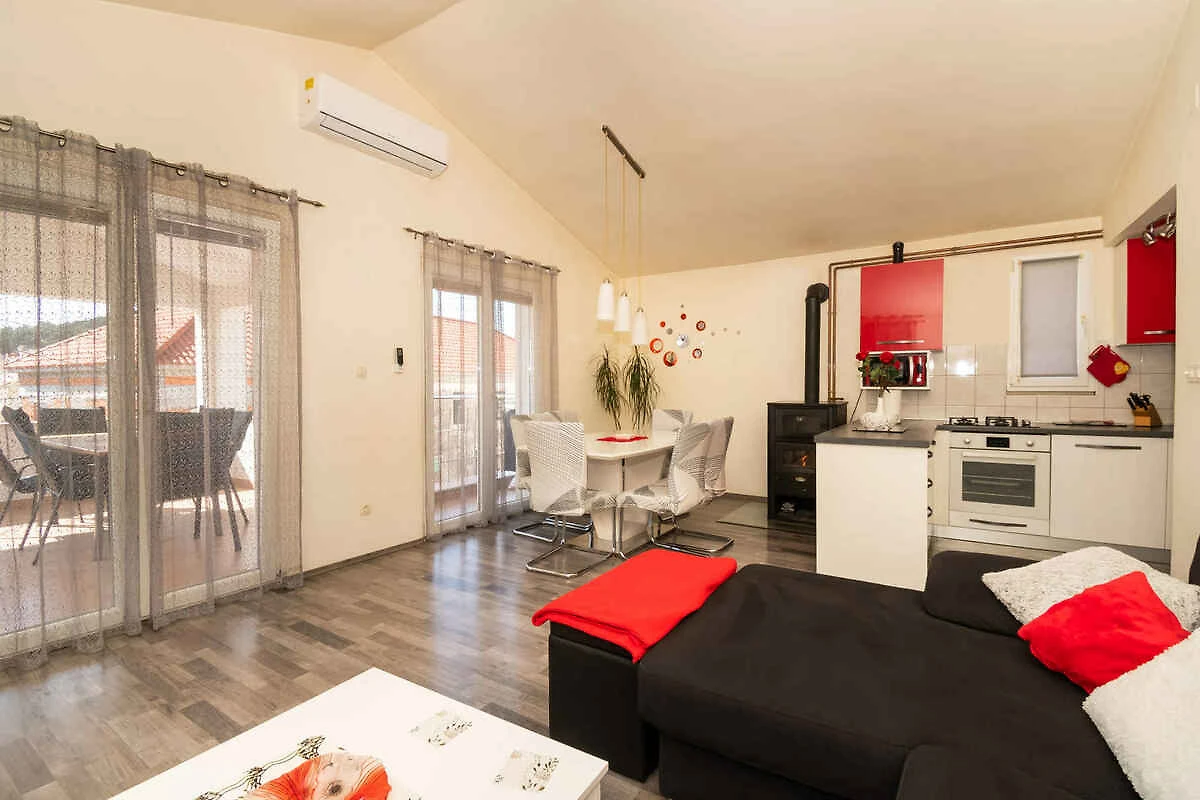 Tribunj. Die Ferienwohnung befindet sich auf einem geschlossenen Gartengrundstück, von einem Zaun begrenzt. Die Zufahrt erfolgt über eine Nebenstrasse (asphaltiert). Parkplatz (für 1 Pkw) auf dem Grundstück.