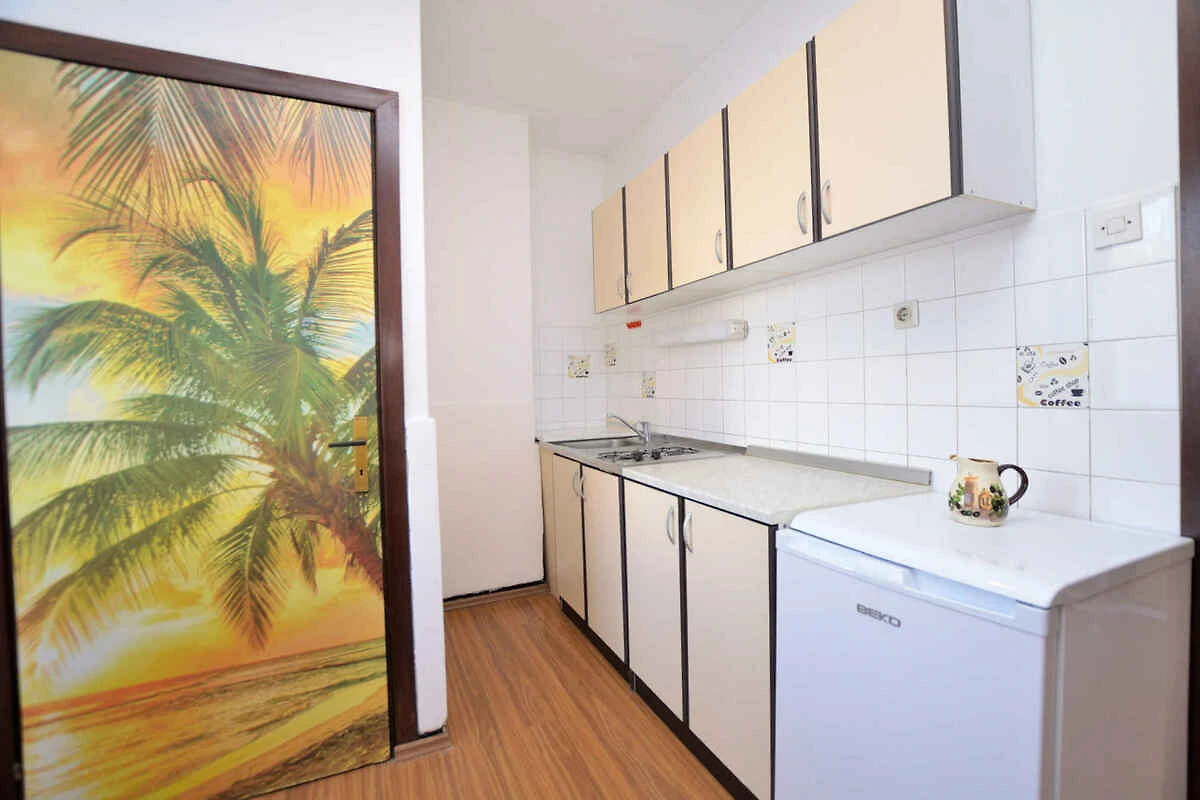 Wohn/Schlafzimmer mit Sitzecke, TV und Zugang zum Balkon. Schlafzimmer (25 qm) mit 1 Doppelbett, TV, Klimaanlage und Zugang zum Balkon. Kochecke im Vorraum mit Gasherd, Kühlschrank und Kaffeemaschine. Bad mit Dusche und WC.