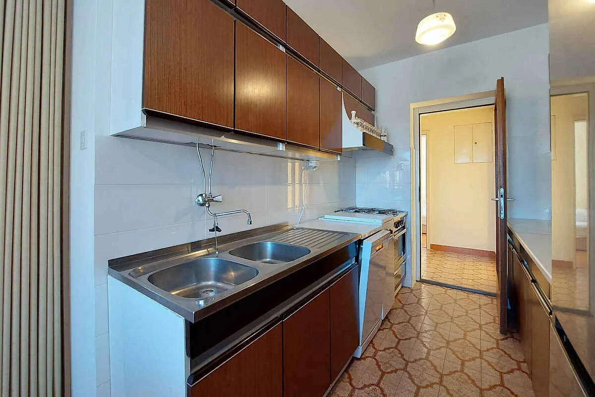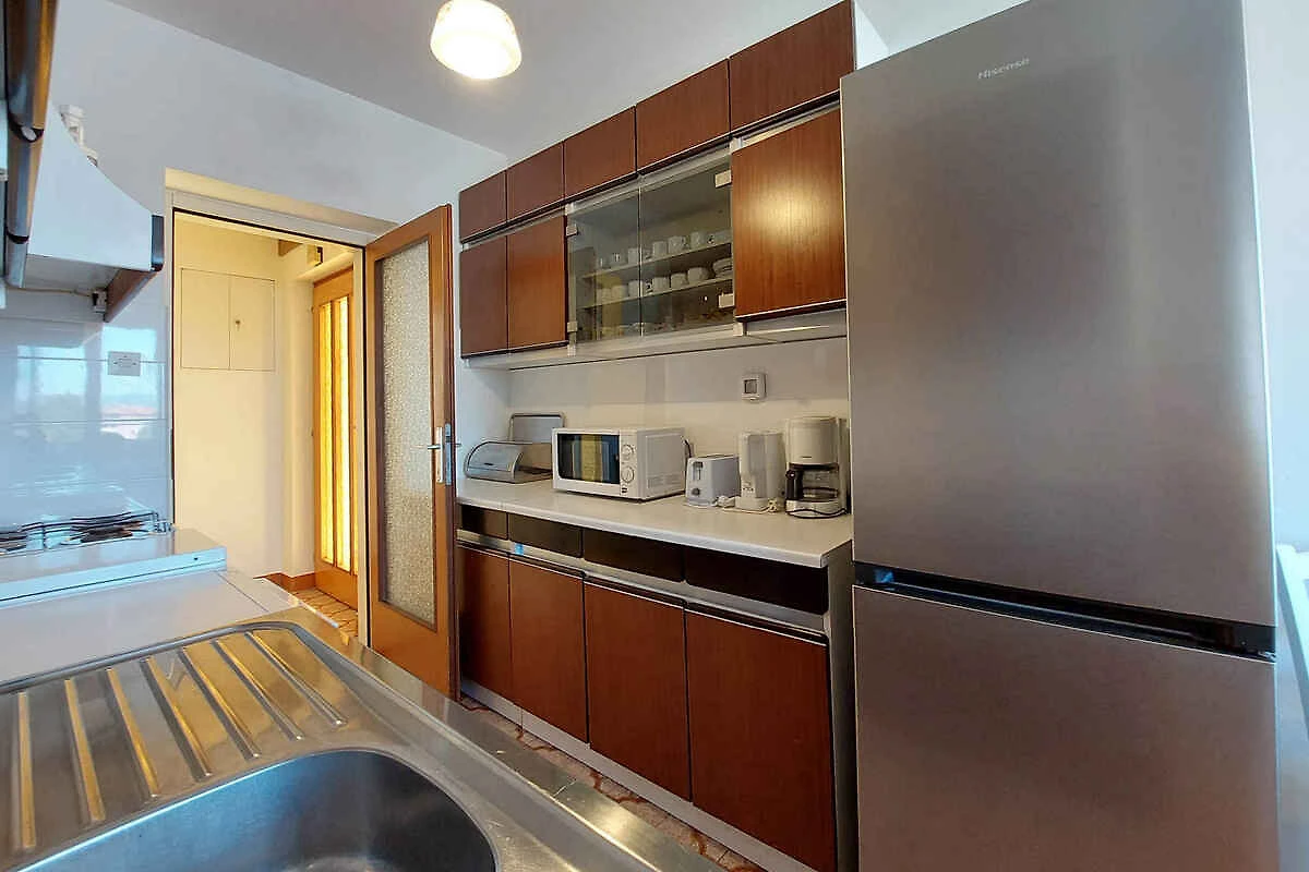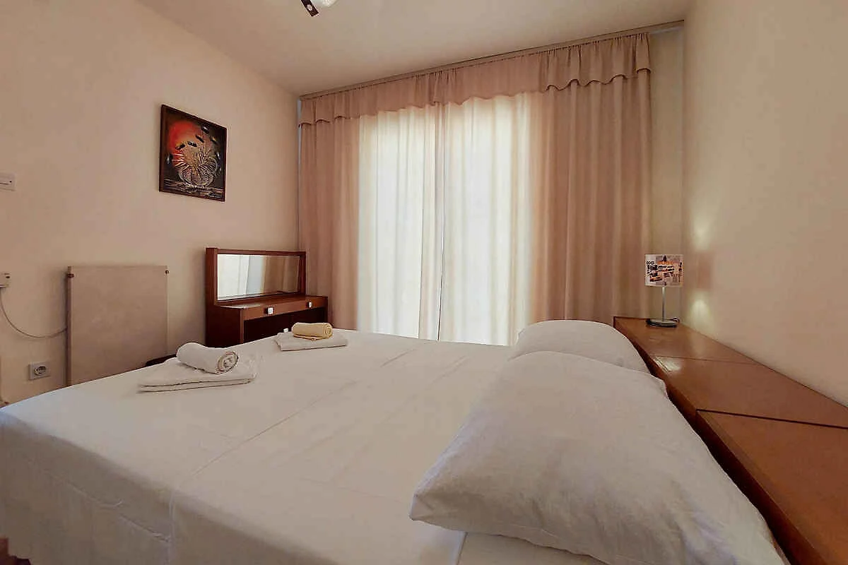 und führt direkt in den Vorraum. Wohnzimmer mit TV, Radio und Zugang zum Balkon. Schlafzimmer (16 qm) mit 1 Doppelbett und Zugang zum Balkon. Schlafzimmer (12 qm) mit 1 Doppelbett. Schlafzimmer (9 qm) mit 1 Einzelbett. Kochecke im Wohnzimmer mit Gasherd (4 Flammen), Backofen, Geschirrspüler, Kühlschrank (Eisfach), Mikrowelle, Kaffeemaschine, Toaster und elektrischem Wasserkocher. Bad mit Dusche. Bad mit Badewanne, Waschmaschine und Föhn.