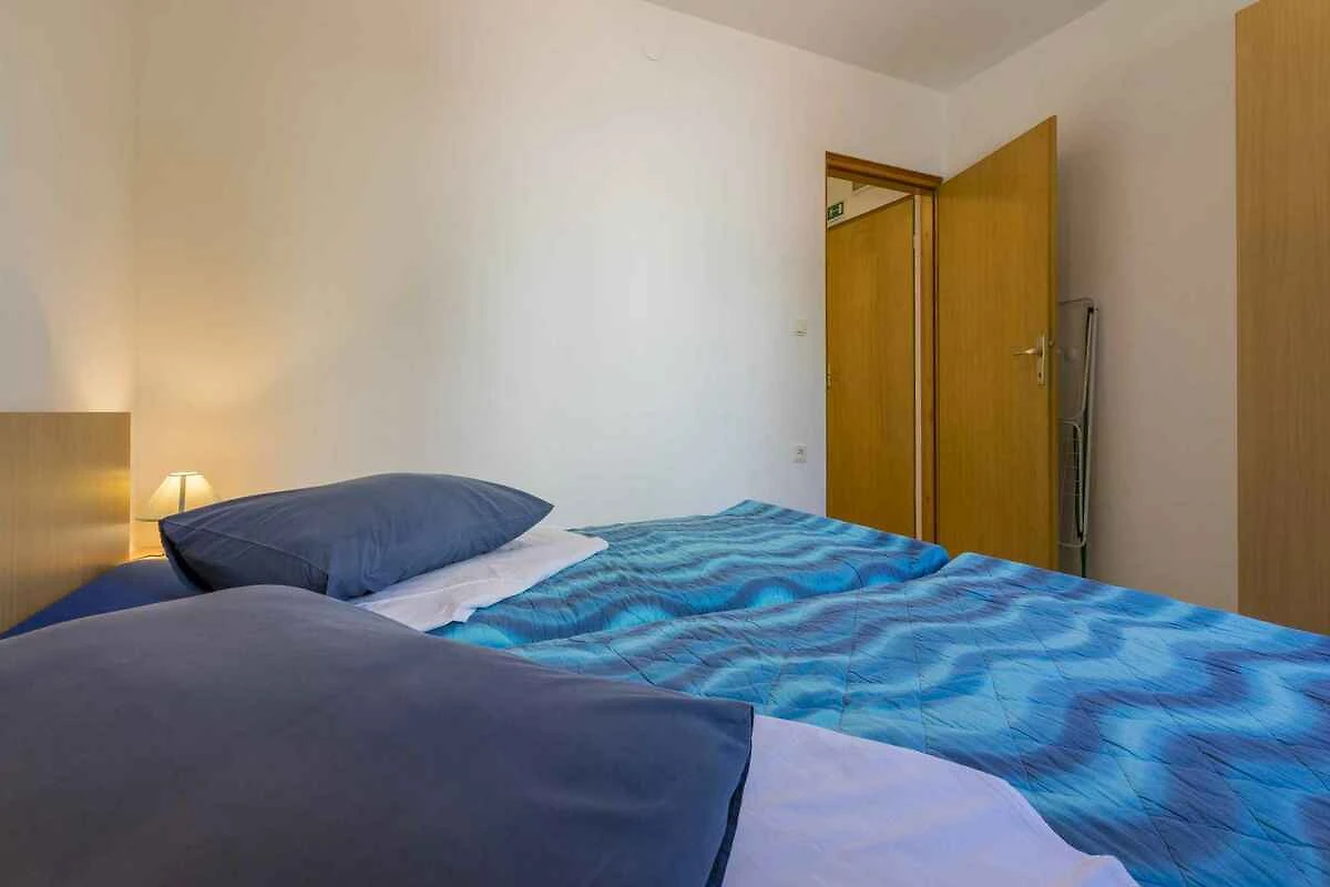 Schlafzimmer mit 2 Einzelbetten. Kochecke im Wohnzimmer mit Gasherd, Kühlschrank, Kaffeemaschine, Toaster und elektrischem Wasserkocher. Bad mit Dusche und WC. Wohnzimmer mit 1 Zusatzbett auf Couch/Sofa.