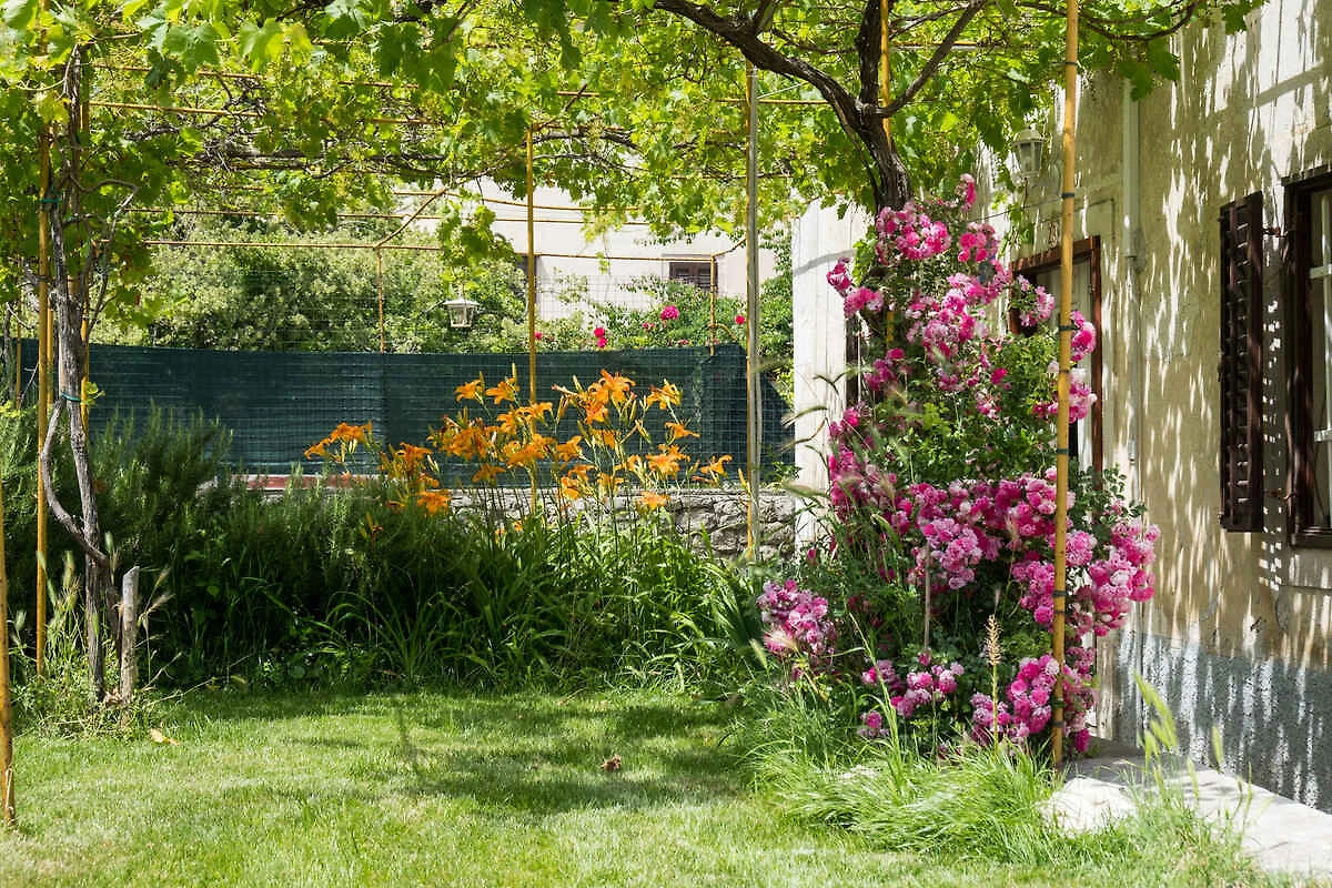 Osor. Das Ferienhaus befindet sich auf einem 660 qm grossen, geschlossenen Gartengrundstück mit Blumen und Bäumen, von einem Zaun begrenzt. Die Zufahrt erfolgt über einen Weg (asphaltiert). Parkplatz auf dem Grundstück.
