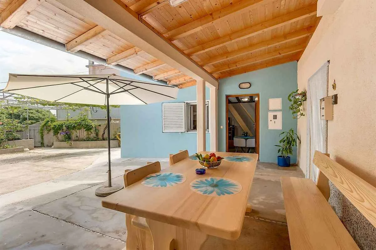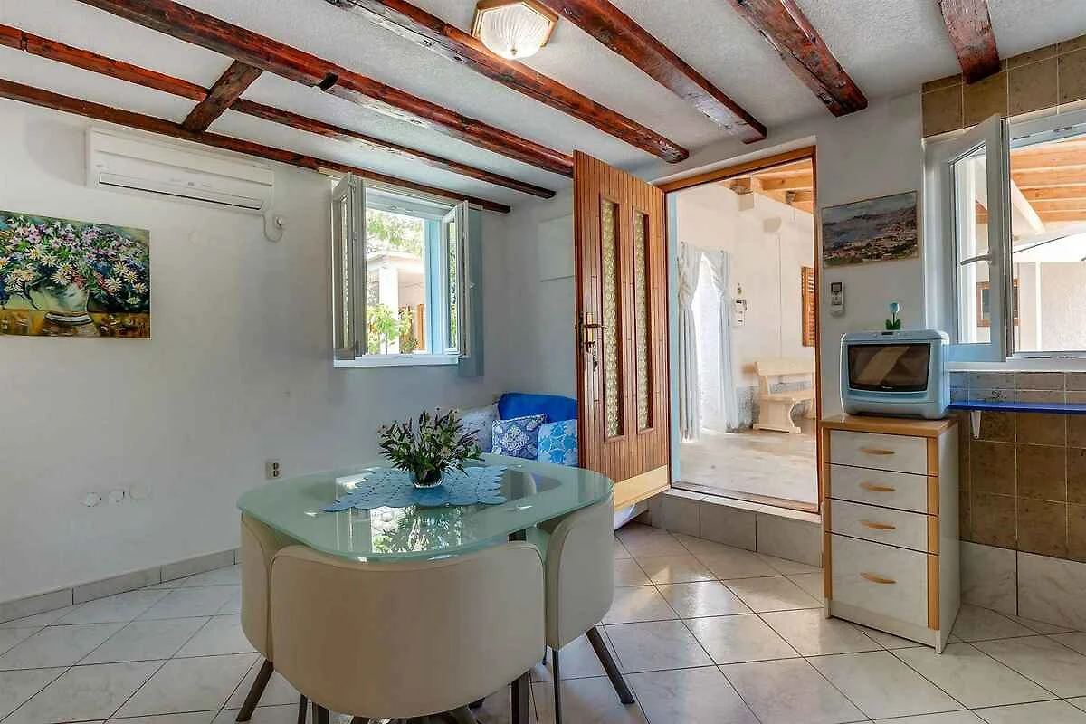 Nerezine. Die Ferienwohnung befindet sich auf einem geschlossenen Gartengrundstück mit Blumen und Bäumen, von einem Zaun begrenzt. Die Zufahrt erfolgt über einen Weg (asphaltiert). Parkplatz auf dem Grundstück.