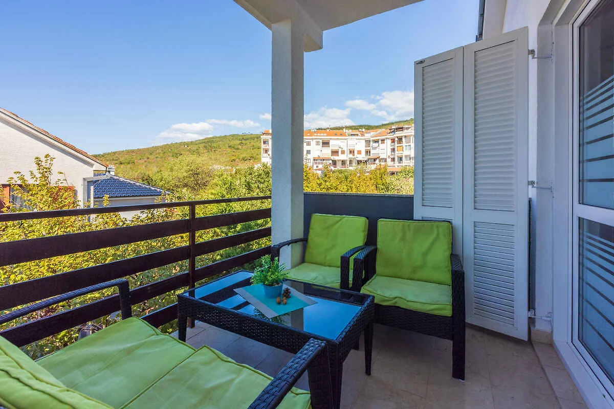 Wohnzimmer mit 2 Zusatzbetten auf Couch/Sofa, TV, Radio, Essecke und Zugang zum Balkon. Schlafzimmer mit 1 Doppelbett. Kochecke im Wohnzimmer mit Essecke, Elektroherd, Dunstabzugshaube, Geschirrspüler, Kühlschrank (Eisfach), Kaffeemaschine, Toaster und elektrischem Wasserkocher. Bad mit Dusche, WC und Föhn.