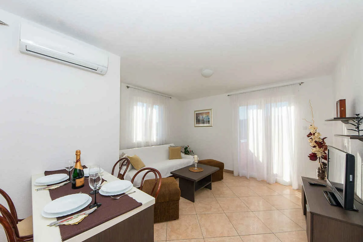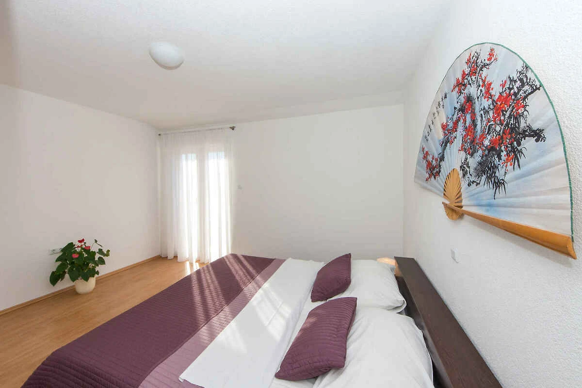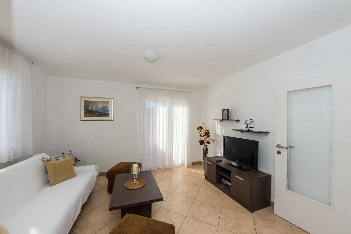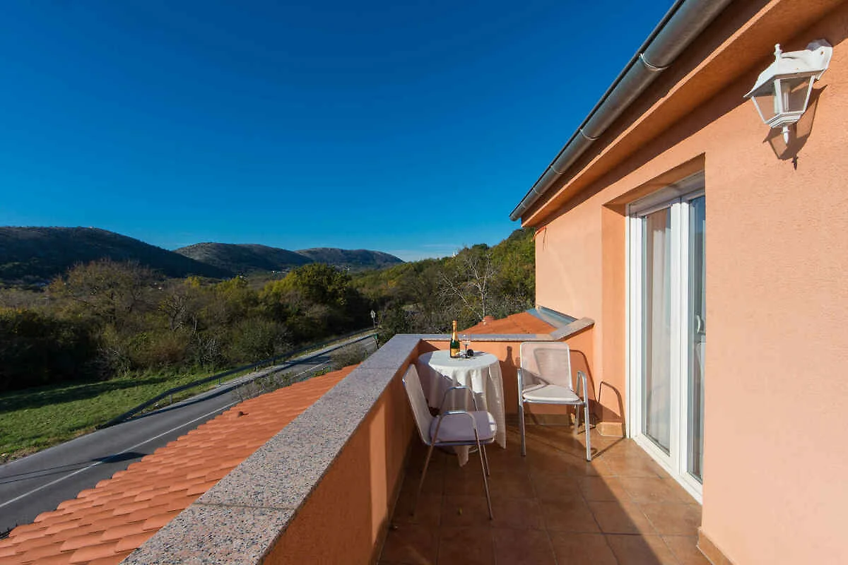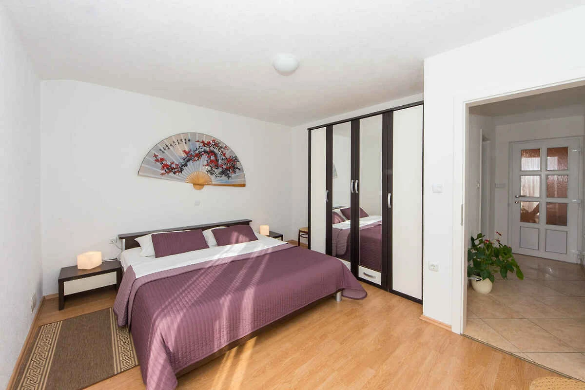 Bribir. Die Ferienwohnung befindet sich auf einem geschlossenen Gartengrundstück mit Wiese und Bäumen, von einem Zaun begrenzt. Der Vermieter wohnt ständig im Haus, nutzt jedoch einen separaten Eingang. Die Zufahrt erfolgt direkt von der Hauptstrasse (asphaltiert). Parkplatz auf dem Grundstück.