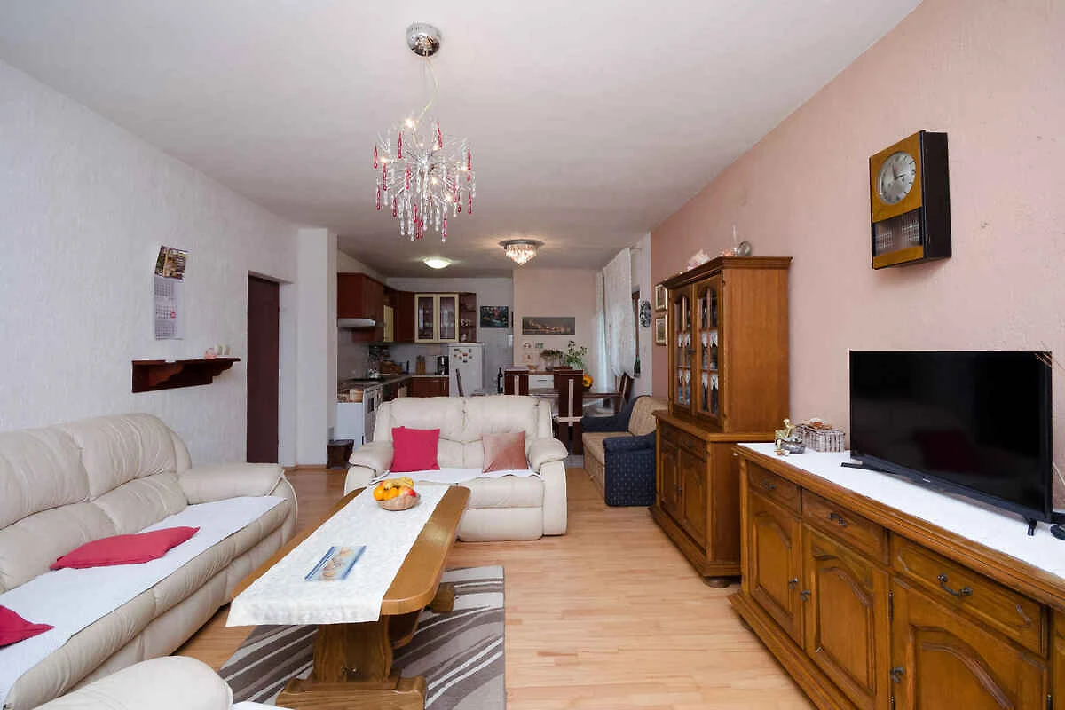Wohnzimmer mit 1 Einzelbett, Sitzecke, TV und Essecke (6 Plätze). Schlafzimmer (17 qm) mit 1 Doppelbett und 1 Einzelbett. Schlafzimmer (15 qm) mit 1 Doppelbett und Zugang zum Balkon. Kochecke im Wohnzimmer mit Gasherd, Backofen, Geschirrspüler, Kühlschrank, Kaffeemaschine und elektrischem Wasserkocher. Bad mit Dusche und WC. Bad mit Badewanne und WC.