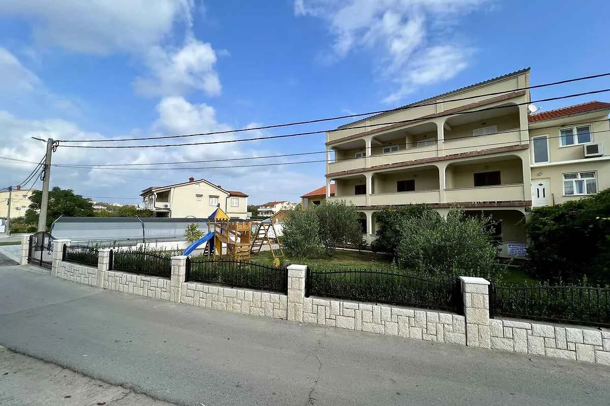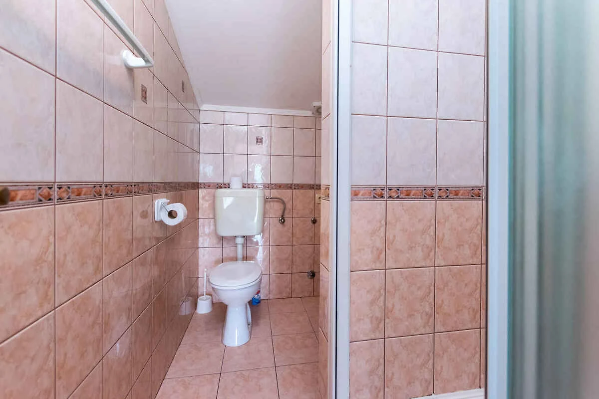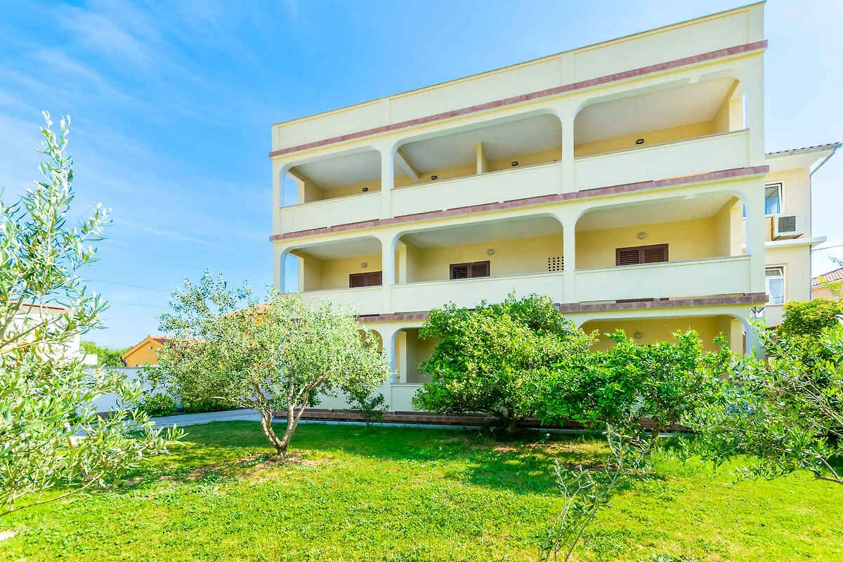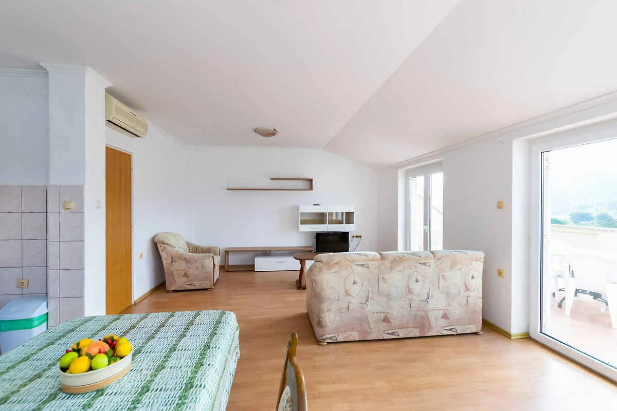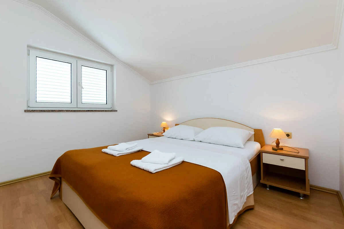 Lopar. Die Ferienwohnung befindet sich auf einem Gartengrundstück mit Wiese und Bäumen. Der Vermieter wohnt im Haus, nutzt jedoch einen separaten Eingang. Die Zufahrt erfolgt über eine Nebenstrasse (asphaltiert). Parkplatz auf dem Grundstück.