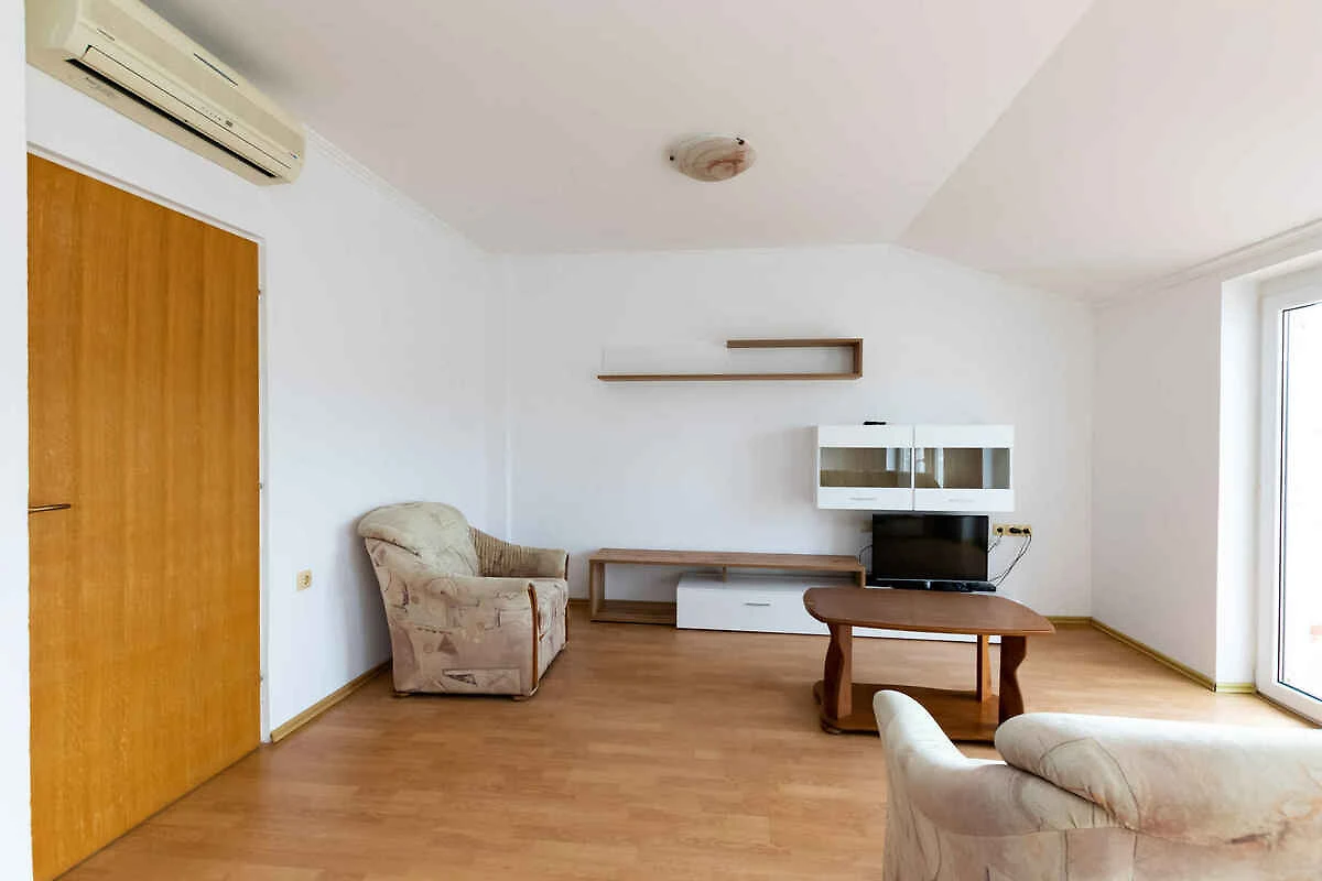 Wohnzimmer mit 2 Zusatzbetten auf Doppelausziehcouch, Sitzecke, TV und Essecke. Schlafzimmer (14 qm) mit 1 Doppelbett. Kochnische im Wohnzimmer mit Gasherd, Backofen, Kühlschrank, Mikrowelle, Kaffeemaschine, Toaster und elektrischem Wasserkocher. Bad mit Dusche und WC.
