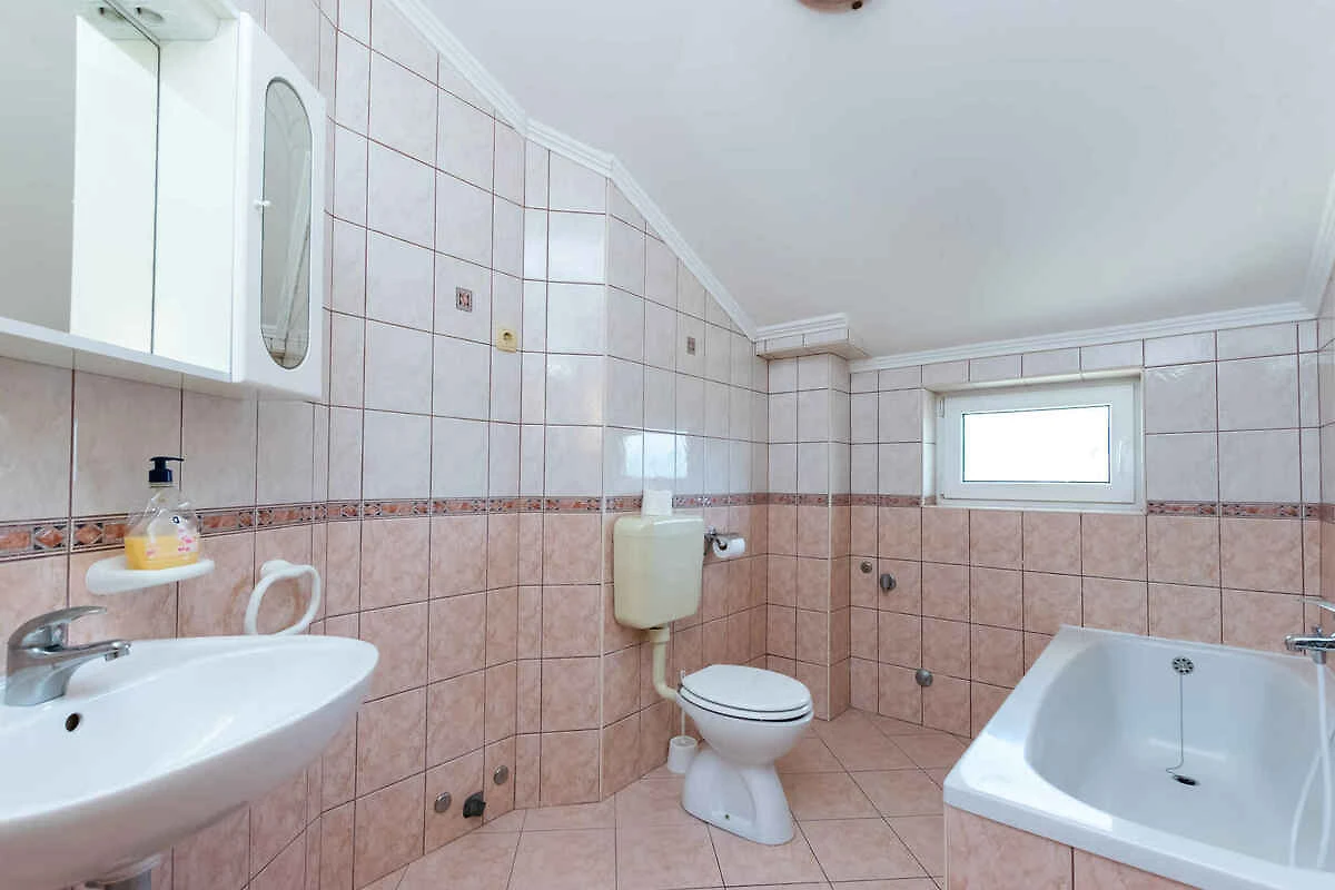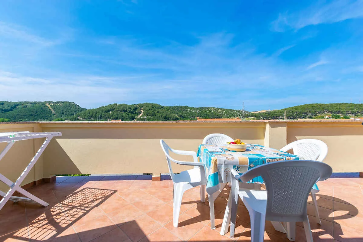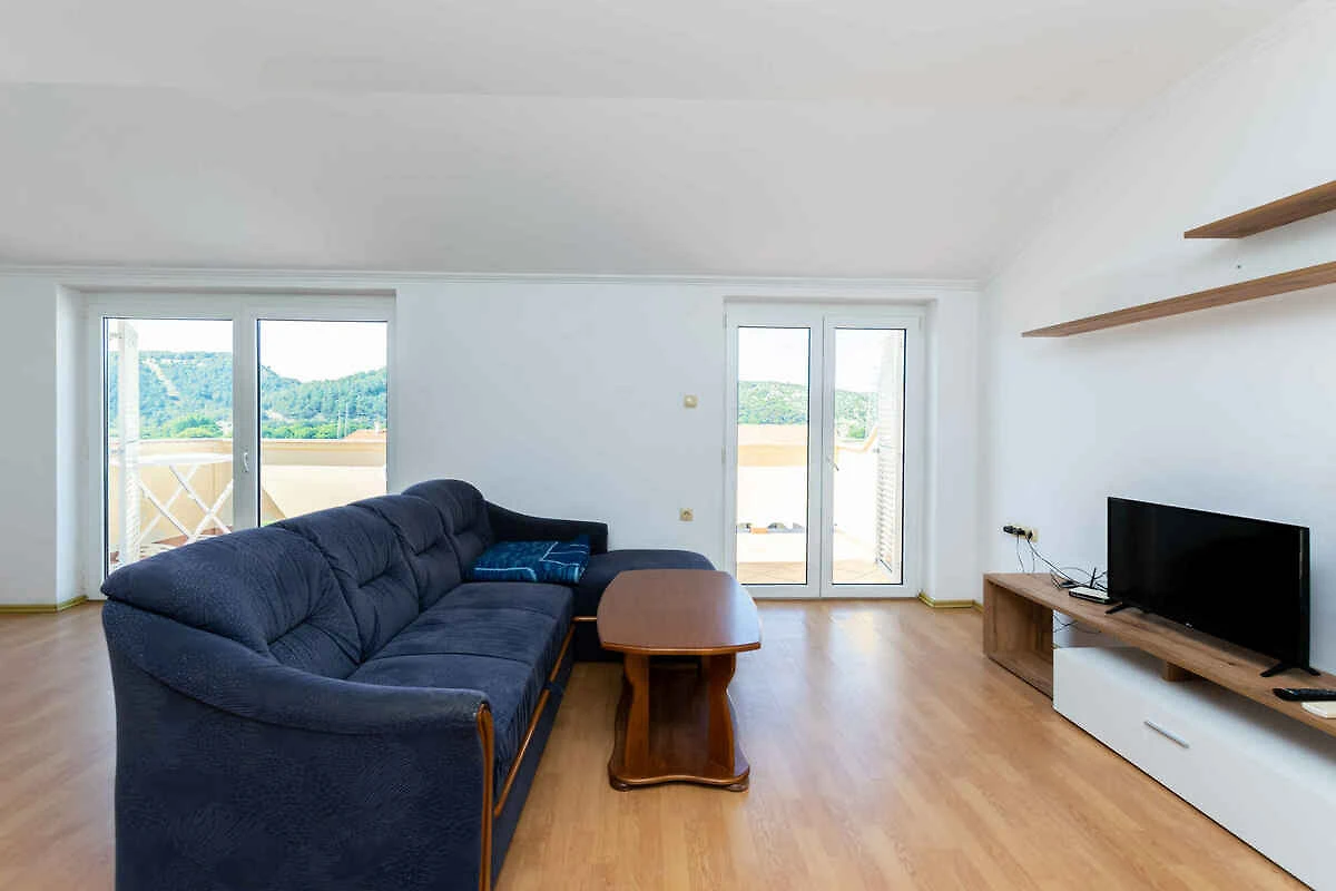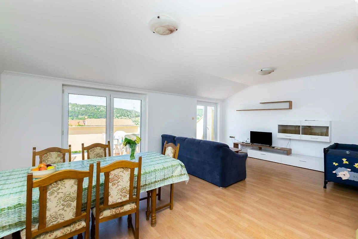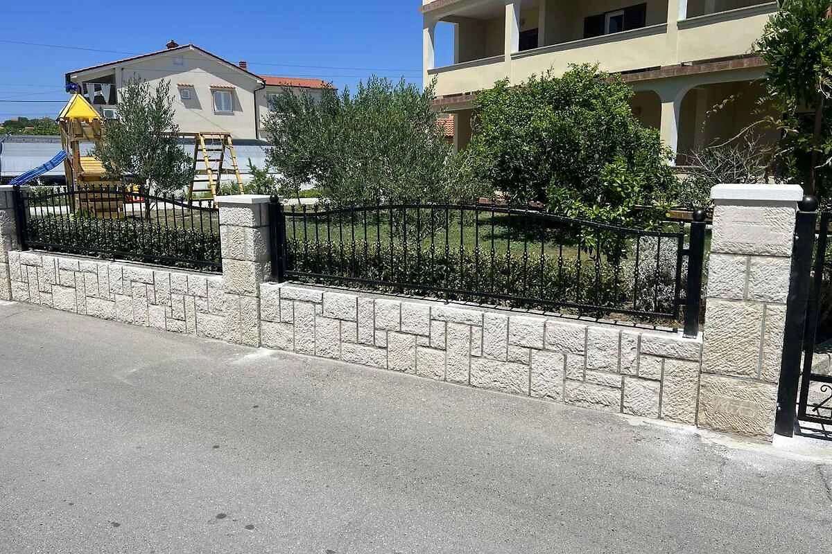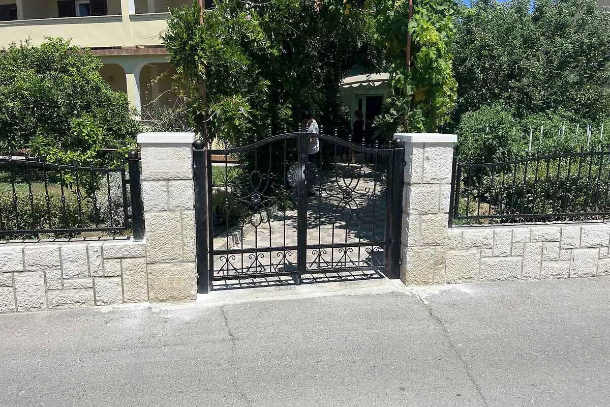 Lopar. Die Ferienwohnung befindet sich auf einem geschlossenen Gartengrundstück mit Wiese und Bäumen, von einem Zaun begrenzt. Der Vermieter wohnt im Haus, nutzt jedoch einen separaten Eingang. Die Zufahrt erfolgt über eine Nebenstrasse (asphaltiert). Parkplatz auf dem Grundstück.