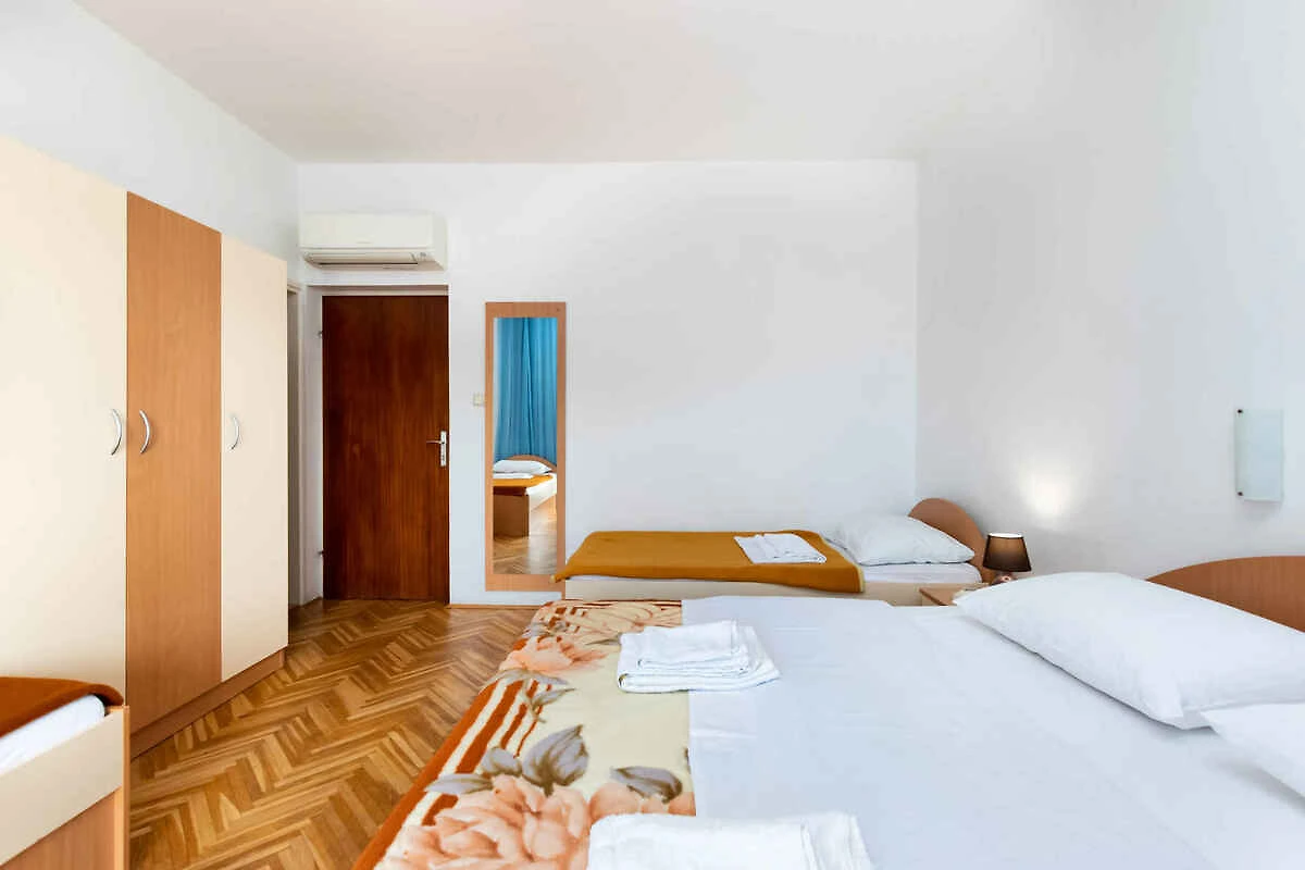 Wohnzimmer mit Sitzecke, TV und Essecke (8 Plätze). Schlafzimmer (12 qm) mit 1 Doppelbett. 2 Schlafzimmer jeweils (16 qm) mit 1 Doppelbett, 1 Einzelbett und Zugang zum Balkon. Kochnische im Wohnzimmer mit Gasherd, Backofen, Geschirrspüler, Kühlschrank, Mikrowelle, Kaffeemaschine, Toaster und elektrischem Wasserkocher. 3 Bäder jeweils mit Dusche und WC.