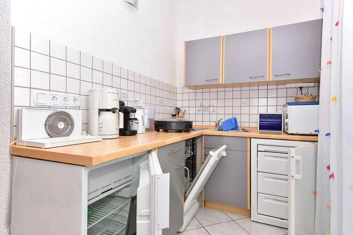 Der Eingang in Ihre Ferienwohnung ist ebenerdig und führt direkt in den Vorraum. Wohnzimmer mit 2 Zusatzbetten auf Doppelausziehcouch. Schlafzimmer mit 1 Doppelbett. Kochnische im Wohnzimmer mit Gasherd, Backofen, Geschirrspüler, Kühlschrank, Mikrowelle, Kaffeemaschine, Toaster, elektrischem Wasserkocher und Zugang zum Balkon. Bad mit Dusche und WC.
