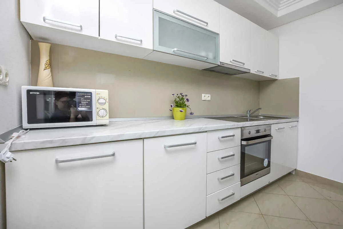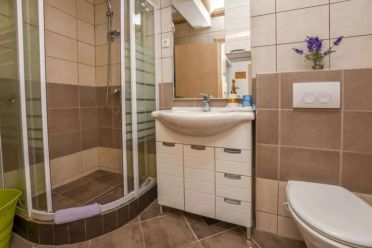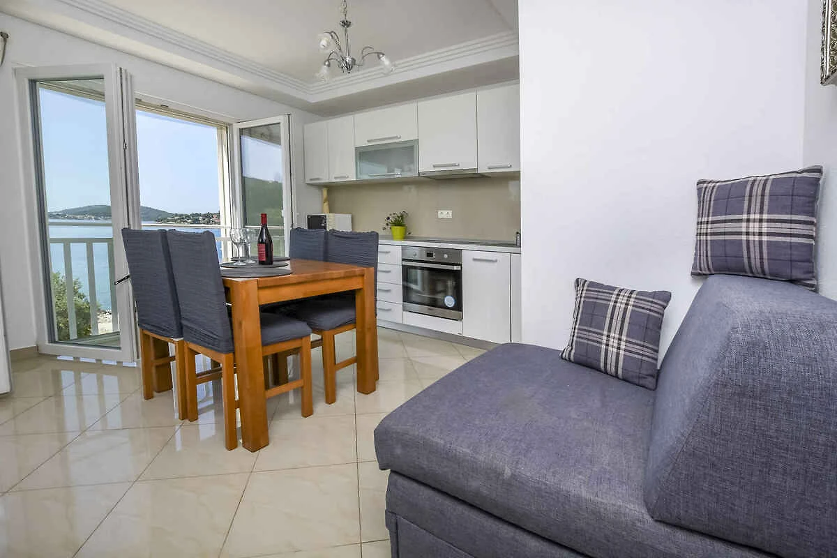Rogoznica. Die Ferienwohnung befindet sich auf einem geschlossenen Gartengrundstück mit Bäumen, von einer Mauer begrenzt. Der Vermieter wohnt im Haus, nutzt jedoch einen separaten Eingang. Der grösste Vorteil ist die Nähe zum Strand, der nur 10 m entfernt ist. Die Zufahrt erfolgt direkt von der Hauptstrasse (asphaltiert). Parkplatz auf dem Grundstück.
