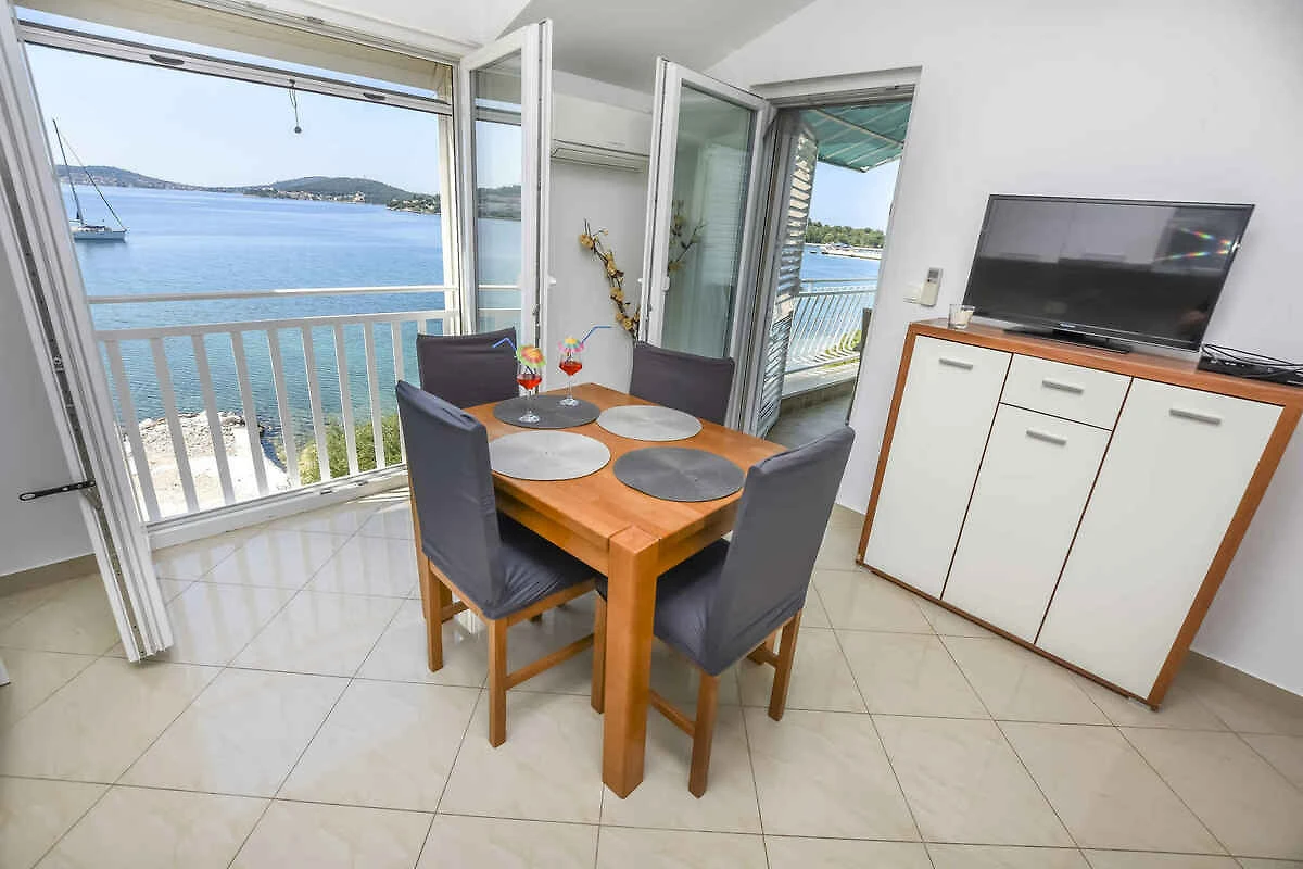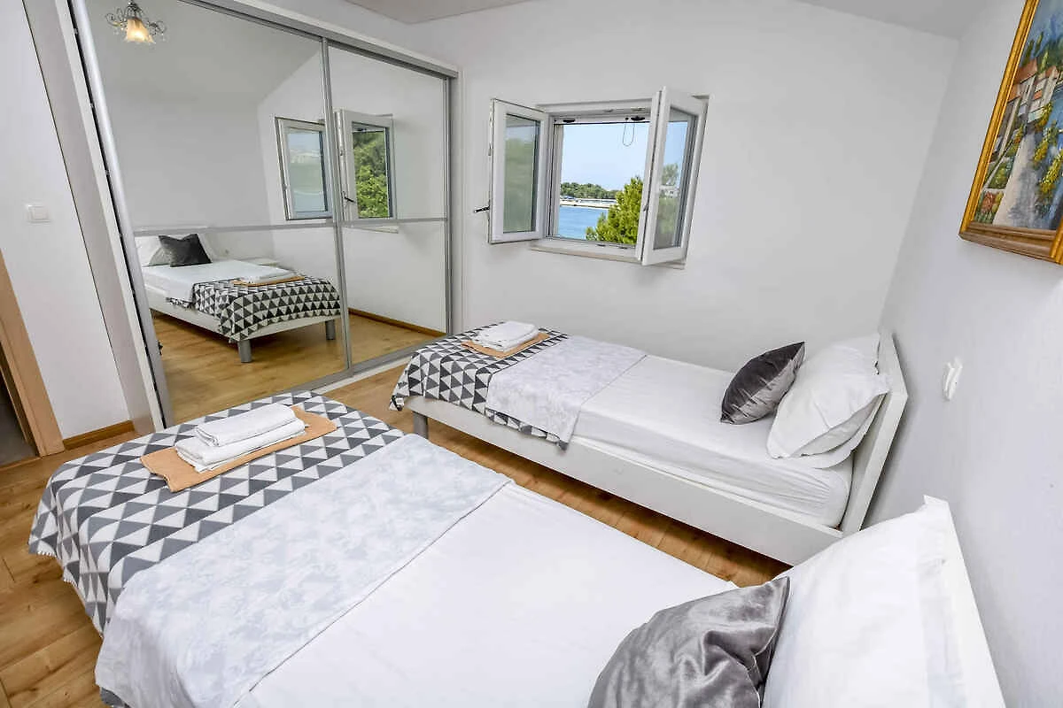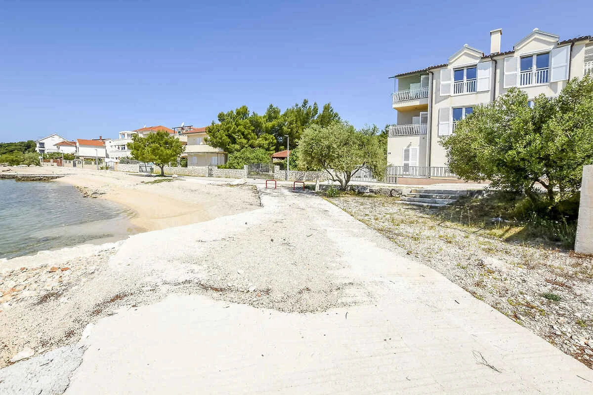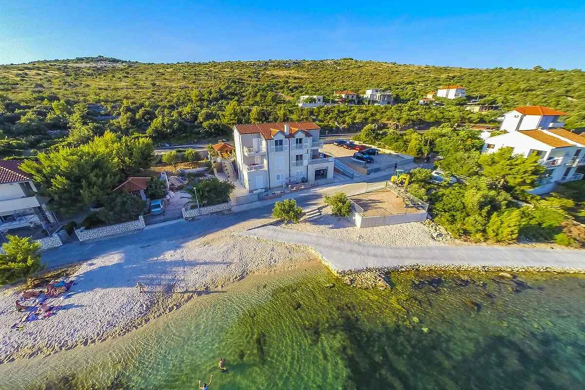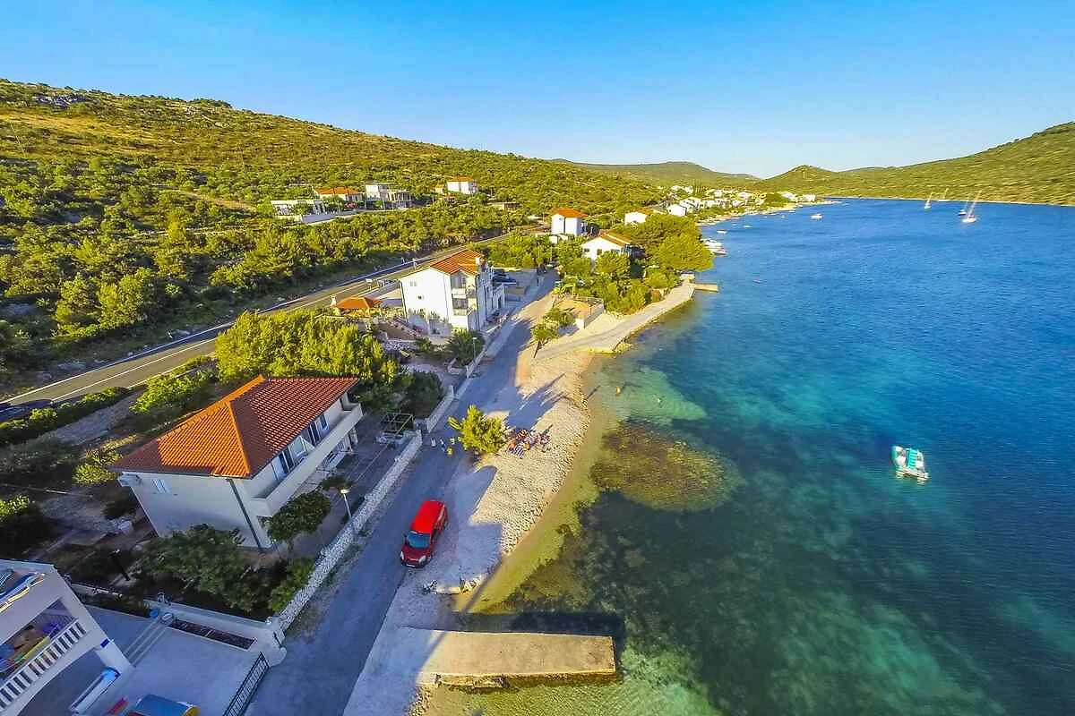 Rogoznica. Die Ferienwohnung befindet sich auf einem geschlossenen Gartengrundstück mit Bäumen, von einer Mauer begrenzt. Der Vermieter wohnt im Haus, nutzt jedoch einen separaten Eingang. Der grösste Vorteil ist die Nähe zum Strand, der nur 10 m entfernt ist. Die Zufahrt erfolgt direkt von der Hauptstrasse (asphaltiert). Parkplatz auf dem Grundstück.