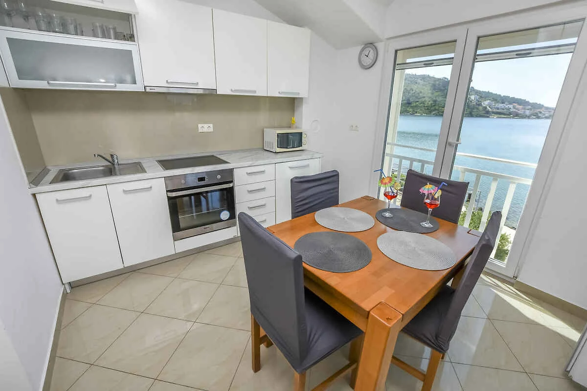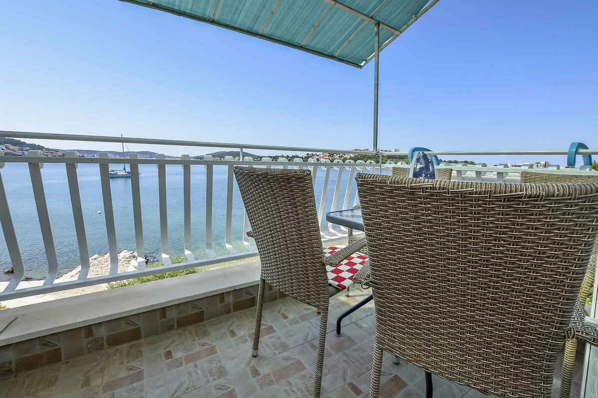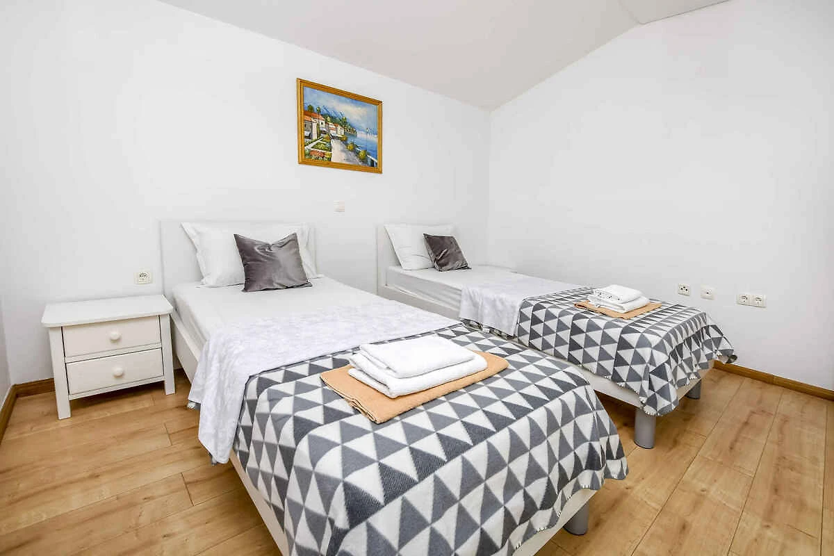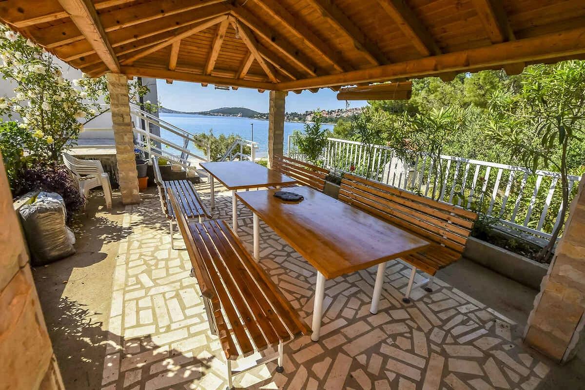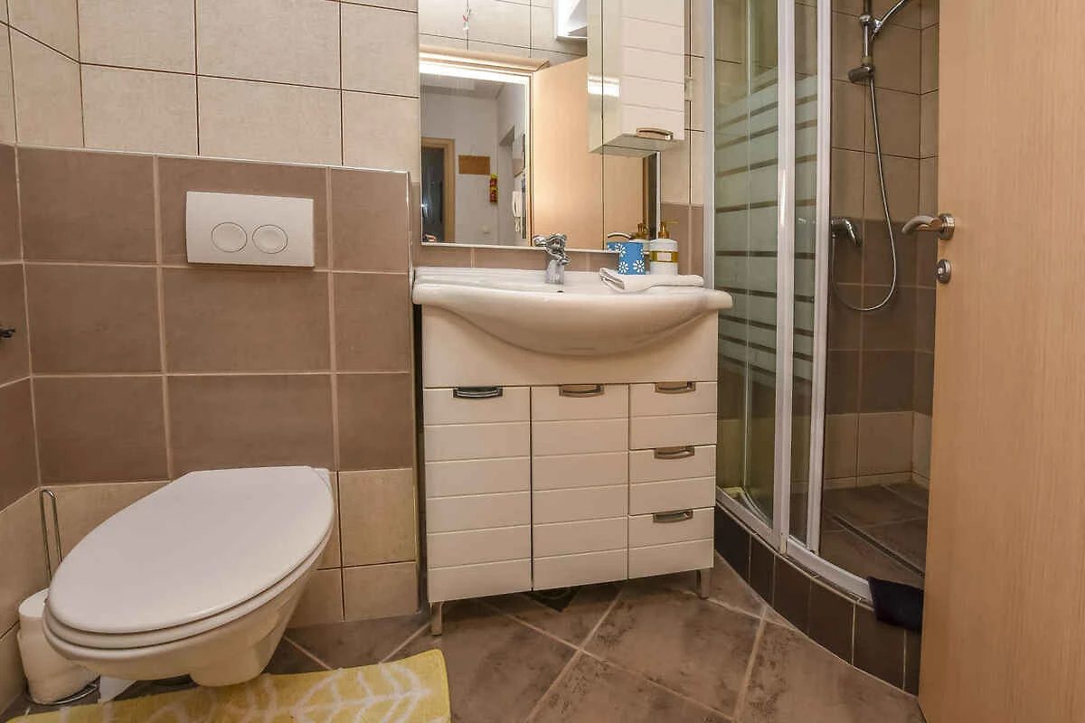 Rogoznica. Die Ferienwohnung befindet sich auf einem geschlossenen Gartengrundstück mit Bäumen, von einer Mauer begrenzt. Der Vermieter wohnt im Haus, nutzt jedoch einen separaten Eingang. Der grösste Vorteil ist die Nähe zum Strand, der nur 10 m entfernt ist. Die Zufahrt erfolgt direkt von der Hauptstrasse (asphaltiert). Parkplatz auf dem Grundstück.